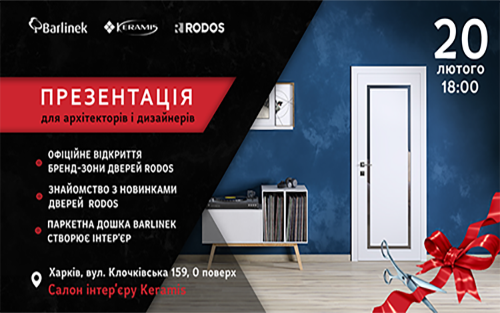 Запрошуємо вас на презентацію на базі клубу дизайнерів та архітекторів Keramis "Відкриття бренд-зони та новинки дверей Rodos. Паркетна дошка Barlinek, яка створює інтер'єр".