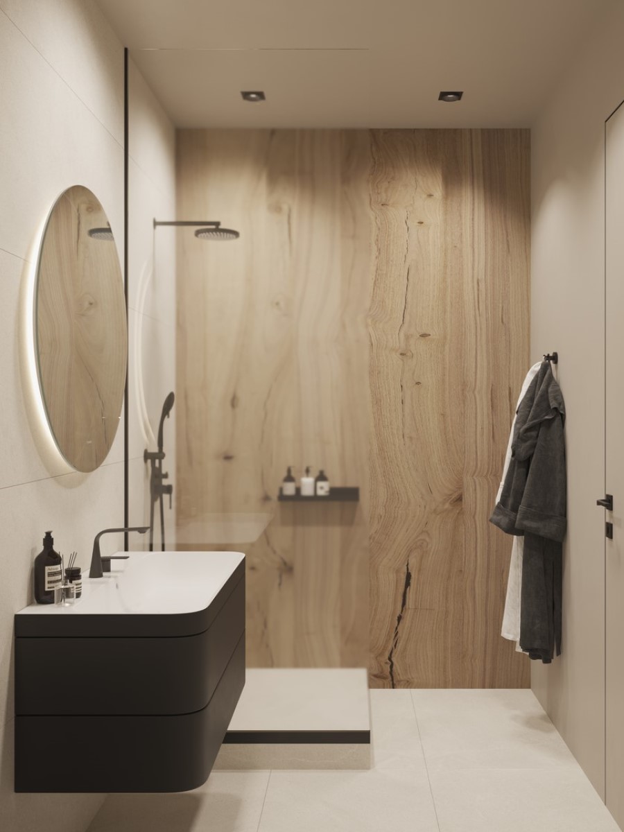 Для более практичных людей всегда есть альтернатива - использование в отделке прочных и влагоустойчивых современных материалов. Качественная керамогранитная плитка “под дерево” или виниловое покрытие, прекрасно имитирующие узор массива разных древесных пород могут использоваться как для стен, так и для пола. Стильные “деревянные” столешницы и фасады мебели могут быть выполнены из специального МДФ с влагоустойчивой пропиткой и покрытием, и выполнять свои функции в любых условиях.