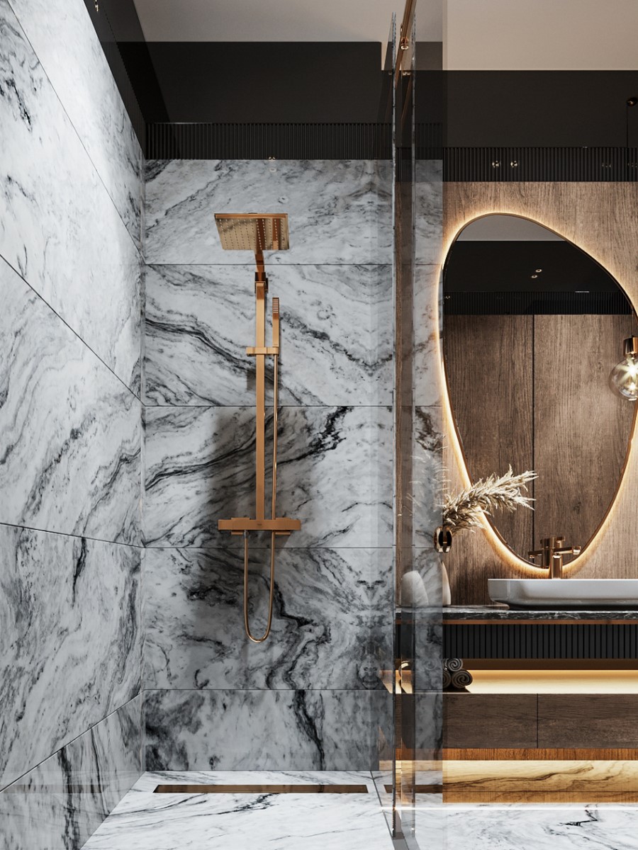 Повсеместный минимализм проник и в сантехнические технологии, применяемые в модных ванных комнатах в 2023 году. Идеальная зона для купания в идеальной квартире нового поколения выглядит как совмещение душевой зоны и отдельного места для расслабления с комфортной и красивой ванной. Вся непримечательная сантехника скрыта от посторонних глаз в стенах, нишах и инсталляциях. Снаружи виднеются только элегантные изгибы рукояток и искрящиеся водные струи.