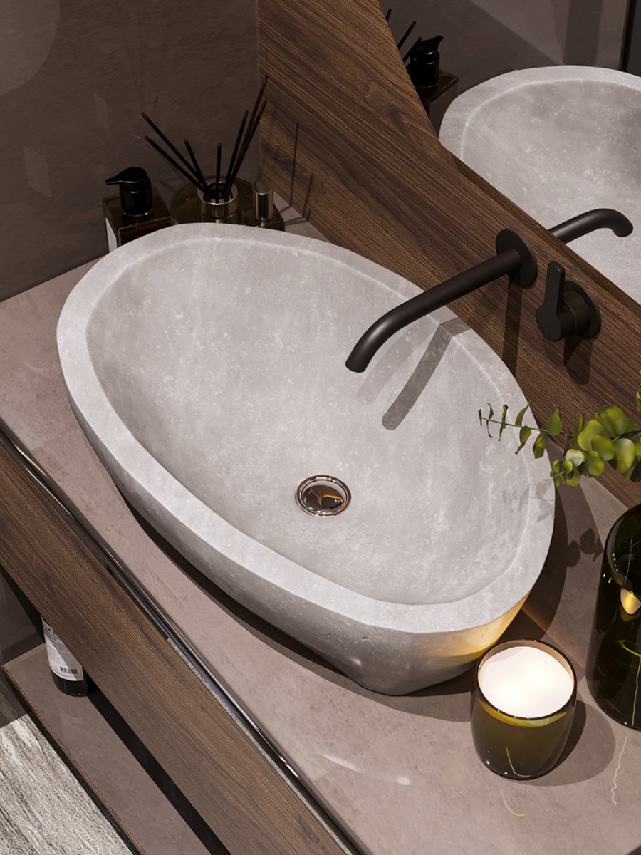 Самый модный тренд 2023 в вопросе раковины - чаши интересных форм, устанавливаемые на столешницу. Округлые, овальные, нестандартных форм, разноцветные моноколоры, или имитирующие природный камень или бетон - вариантов сотни. Для удобства небольшие раковины размещают сразу же парой в общей зоне для умывания. Выглядят такие решения изысканно и аристократично, да и в быту это максимально удобно.