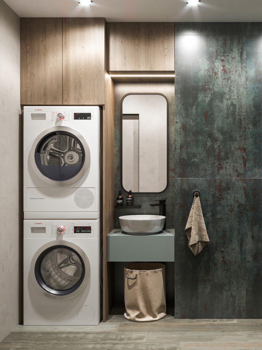 Мало кто может себе позволить отдельное помещение для постирочной. Чаще всего крупную бытовую технику устанавливают в ванной комнате. Среди последних тенденций преобладает скрытие стиральной и сушильной машины за мебельными фасадами или под столешницами. Сушильную машину рекомендуется монтировать колонной над “стиралкой”. Для сохранения нормального микроклимата и снижения степени влажности в помещении применяются вытяжные вентиляторы. За последние годы они стали не только бесшумными, но и получили стильные дизайн и различные расцветки.
