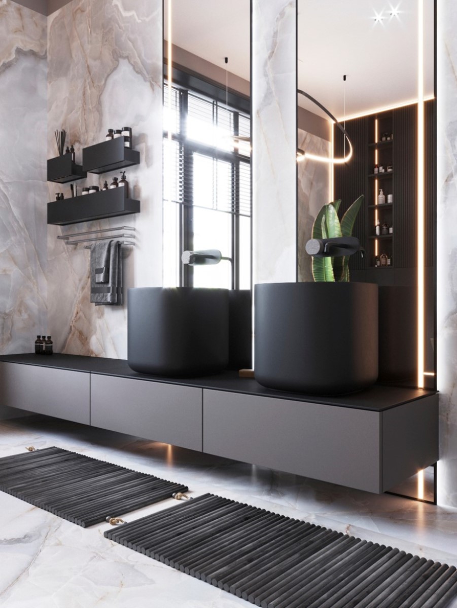Встраиваемые раковины с щелевыми сливами выглядят ультрасовременно и уместно вписываются в индустриальный стиль интерьера.