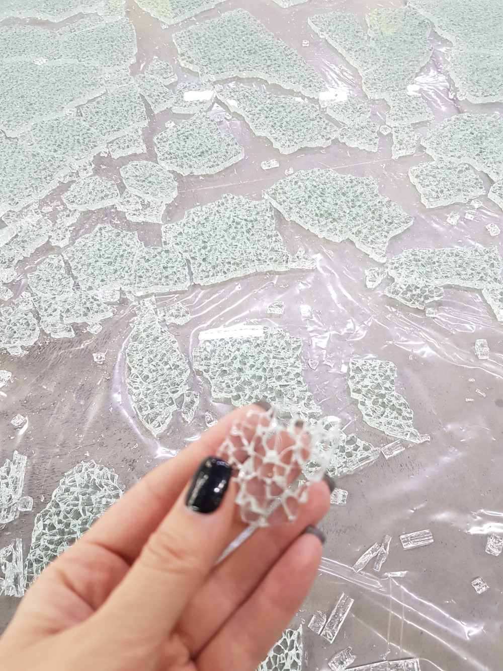 Первым предметом тестирования стала душевая перегородка, изготовленная из закаленного стекла толщиной 8мм, которая при мощном ударе рассыпалась на тысячи частичек неправильной формы, которые не имеют острых граней, а значит – данное стекло является полностью безопасным в бытовом применении.