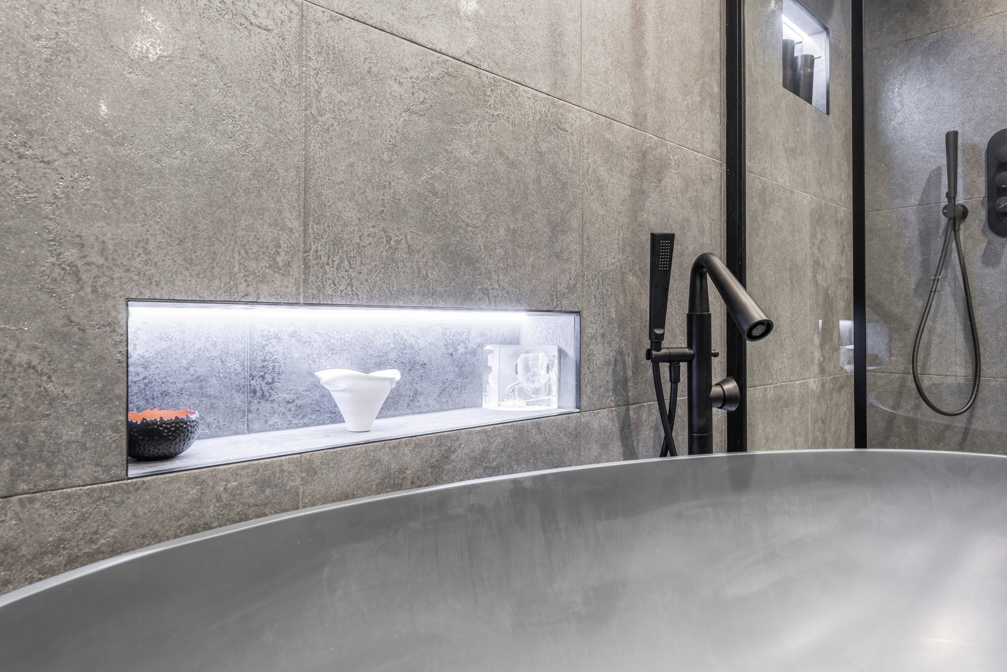 Так как вам досталась маленькая ванная, то темные цвета лучше оставить обладателям больших помещений. Наиболее темная гамма сужает помещение и оказывает эффект замкнутого пространства. Рациональным будет выбор рельефной напольной плитки на несколько тонов темнее настенной. Зато темными и даже черными могут быть детали: акценты даже в самом маленьком помещении можно расставить с помощью черных матовых смесителей, душевой системы, профиля душевой кабины и аксессуаров для ванной.