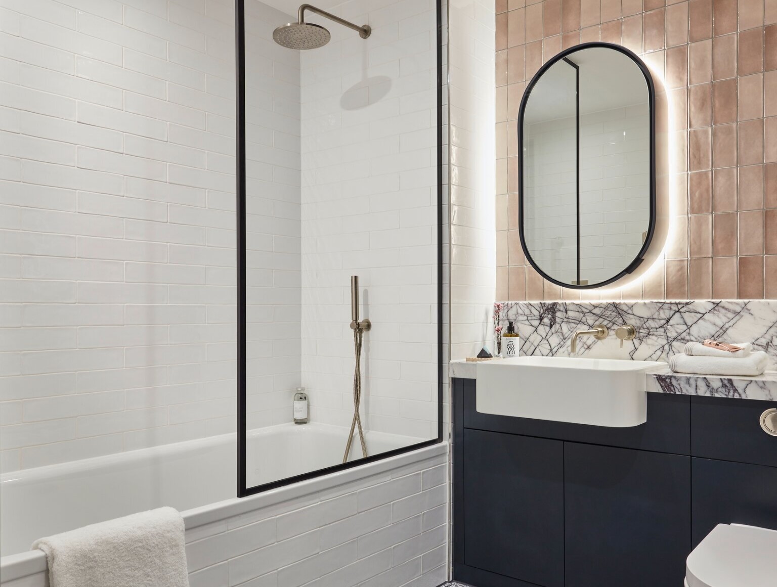 Не рискуйте с цветными швами. Затирка плитки - важная деталь, если речь идет о компактном помещении, которое хотелось бы увеличить. Особенно не стоит креативить с плиткой маленьких форматов, контрастные швы “дробят” стены и они будут казаться еще меньше. Намного лучше использовать затирку в тон облицовочного материала, или и вовсе уложить покрытие бесшовным методом. Монолитная поверхность всегда выглядит больше и объемнее.
