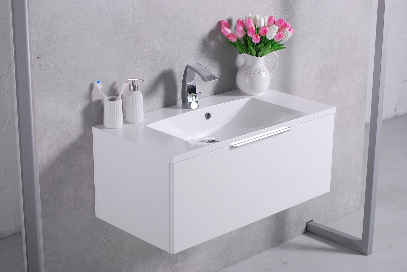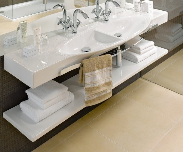 • Подвесная установка. Закрепленная на стене мебель выглядит стильно и эффектно, в помещении ванной комнаты будто прибавляется объема. Под подвесными шкафчиками и тумбами очень просто убирать и мыть полы. Но, с другой стороны, надо детально продумать крепеж для такого монтажа. Он должен с запасом выдерживать мебель и хранящуюся поклажу и надежно удерживаться и в стене, и в мебельном каркасе.