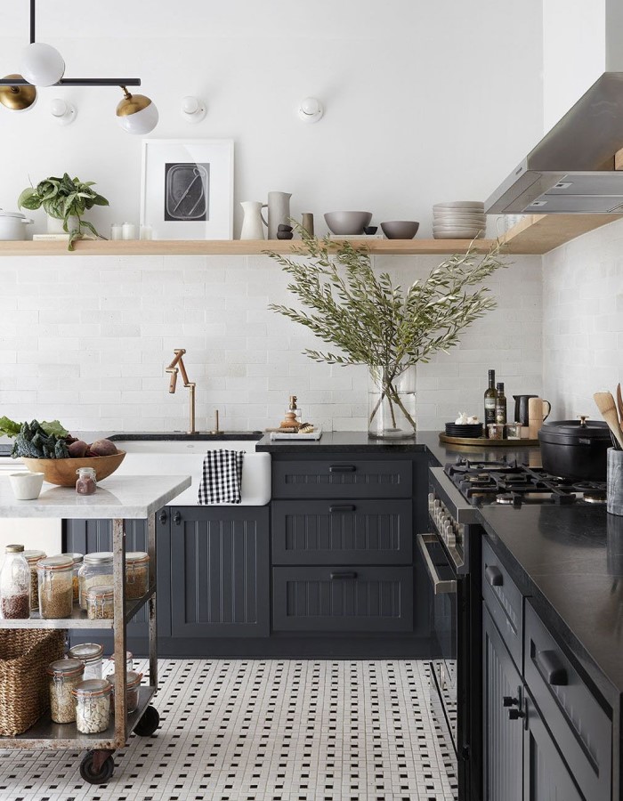 Чтобы не захламлять пространство, предлагаем вам все же выбирать шкафы с фасадами, особенно нижние, а для открытых полок оставить “видное” место и расположить там только то, на чем хочется сосредоточить взгляд.
