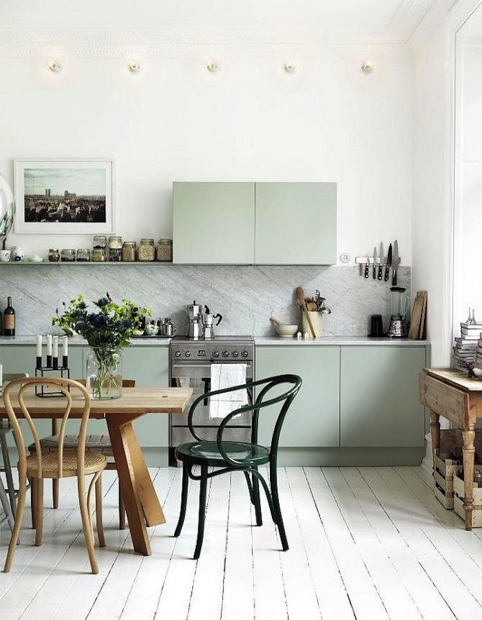 Яркие и пастельные цвета Если есть желание хоть немного разнообразить интерьер и добавить на кухню цвета, используйте для фартука или кухонных фасадов нежный пастельные цвета. Акценты тоже лучше расставлять с помощью приглушенных природных оттенков, которые будут смотреться уместно и не испортят общий вид. Синий, голубой и бирюза- самые популярные среди цветов в сканди-дизайне. Небесная голубая кухня в скандинавском стиле перекликается с белыми стенами и подходит к оттенкам беленой древесины. А глубокая синева напоминает о завораживающих северных морях. Зеленая палитраперекликается с лесными оттенками вечнозеленой хвои и мха. Оттенки пыльной розы - актуальный тренд, проникший во все стили, в том числе и в скандинавский.