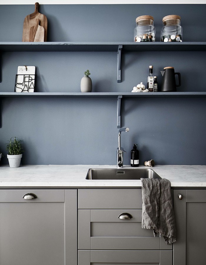 Контрастный чёрный и нейтральный серый Серая кухня в скандинавском стиле - вполне допустимый вариант, для всех кто боится, что белая кухня затеряется на фоне таких же белых стен. Серая палитра нейтральна и не будет конфликтовать с акцентами и декором, но при этом разбавит и оживит комнату. Также серый хорошо будет смотреться на столешнице и в качестве отделки кухонного фартука или пола. Черный сейчас на пике популярности, особенно если это касается декора или других элементов. Для скандинавской кухни самым оригинальным решением будет купить черную кухонную мойку из искусственного камня или стильный черный смеситель).