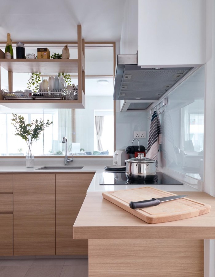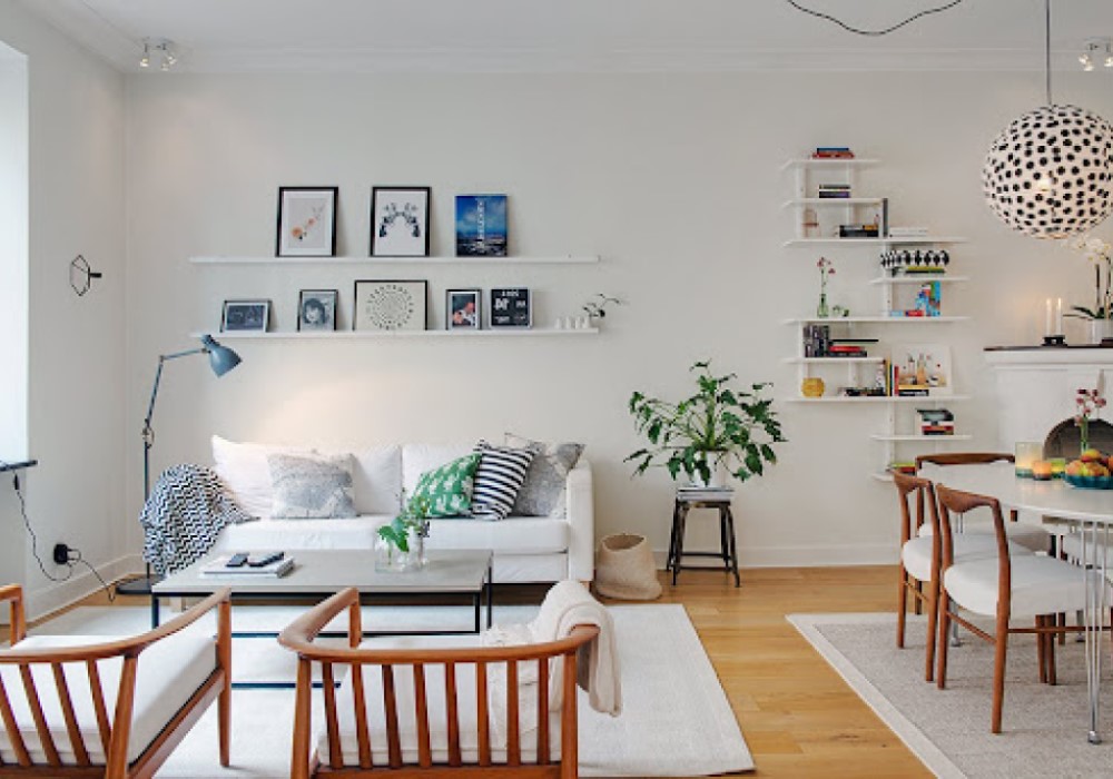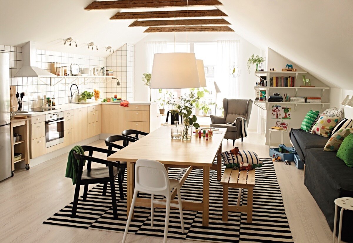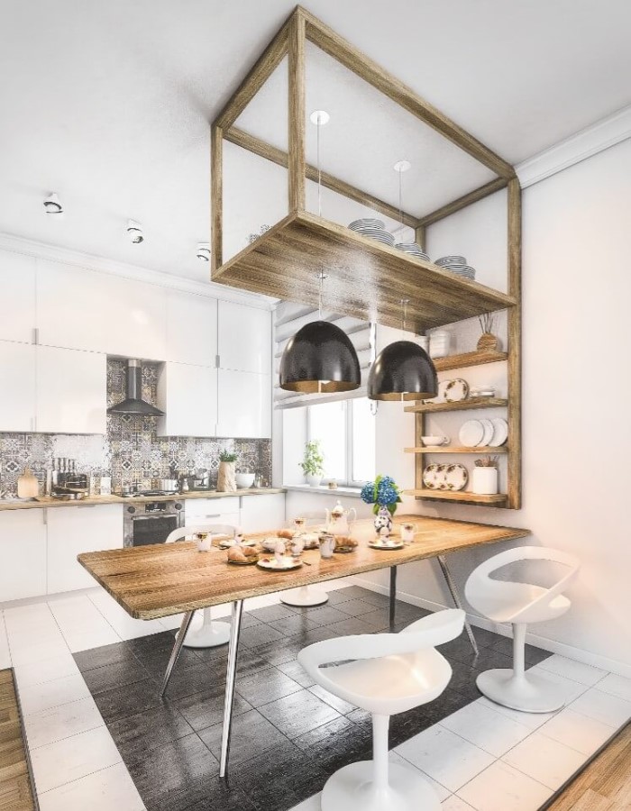 В новой квартире с просторной кухней-студией лучшее решение - объединение зоны для готовки и места для досуга и отдыха. Тем более скандинавские кухни очень стильно выглядят и становятся центральным объектом в любом помещении. Только учтите, что присущая сканди-дизайну легкая небрежность не равняется беспорядку. Открытые полочки с кухонной утварью и обилие предметов декора нуждаются в организации и аккуратном расположении.