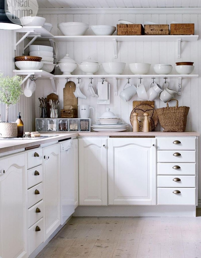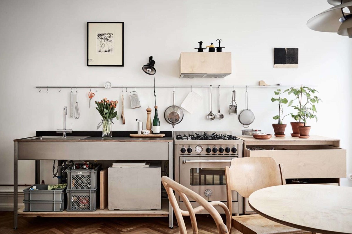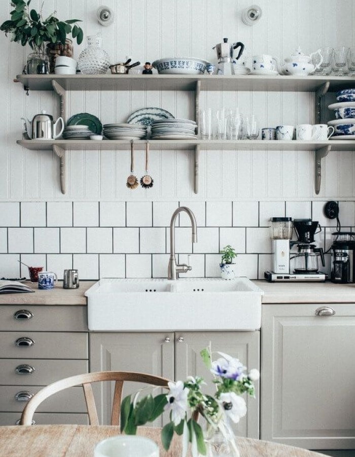 Одно из главных правил скандинавской кухни - открытое хранение. Это значит, что большая часть посуды и утвари будет размещаться на полках, стойках, крючках на рейлингах и в корзинках. И что важно, все это должно быть в чистоте и порядке, но не обязательно педантичном - легкая небрежность вполне приветствуется.
