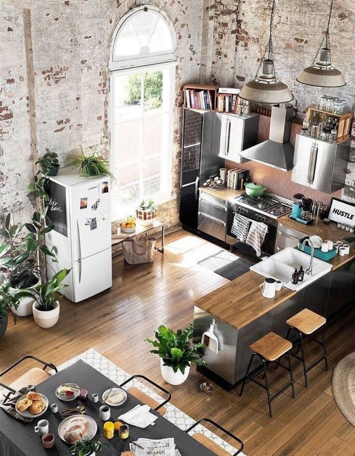 Часто несколько стилей дизайна могут объединяться и перекликаться между собой, в стремлении создать максимально подходящий интерьер. Скандинавский лофт подразумевает окраску стен и потолка обычной интерьерной белой краской прямо поверх старой кирпичной кладки или штукатурки. Это самый простой, но при этом стильный и эффектный, из стилистических приемов при проведении бюджетного ремонта.