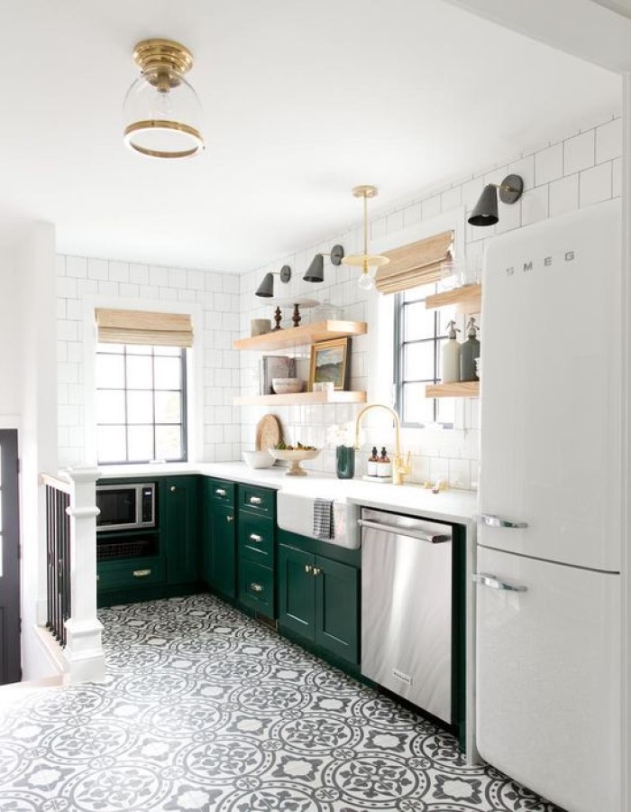 Другой вариант - напольная керамическая плитка: популярный “пэчворк”, с состаренными узорами, шахматная контрастная квадратная плитка, или кафель в форме гексагонов в разных оттенках серого.