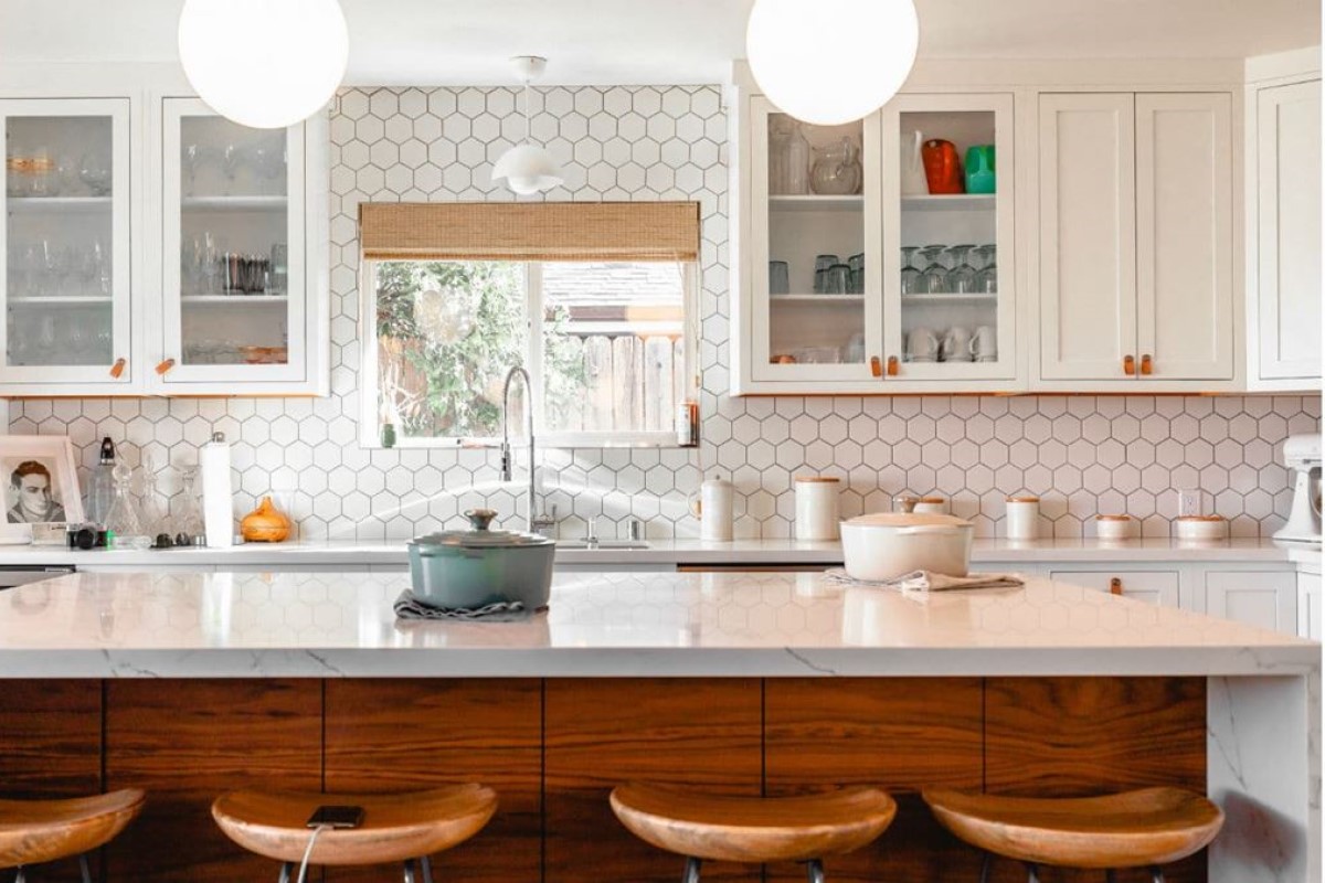 контрастный акцентный фартук: яркая плитка с узорами, мозаика, цементная плиточка ручной работы, защитная панель из закаленного стекла с геометрической фотопечатью.