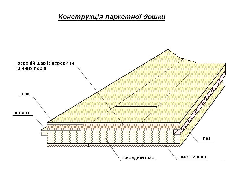 Перш ніж міркувати, яка паркетна дошка найкраща, потрібно розібратися, з чого складається дане покриття. Його ключова особливість – багатошарова конструкція, яка включає: