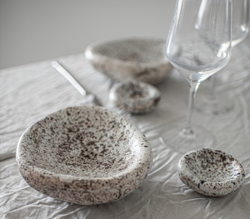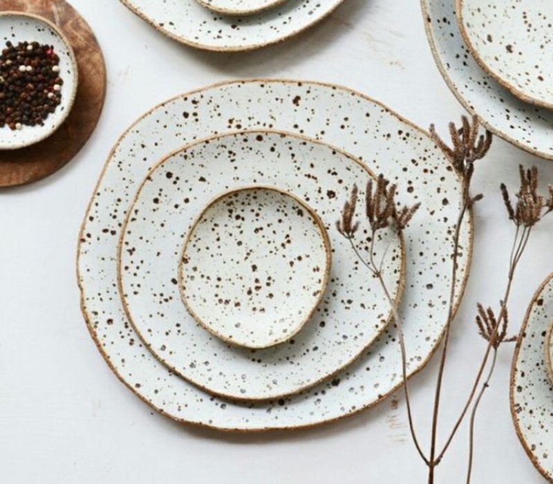 Це може бути як лаконічний однотонний посуд, так і акцентні сервізи, глазуровані, фарфорові, що імітують глину або камінь і виконані в актуальній стилістиці. Кухонне начиння, виконане "під мармур" виглядає гранично модно. Це можуть бути обробні дошки, підставки під гаряче або навіть качалки та лопатки.