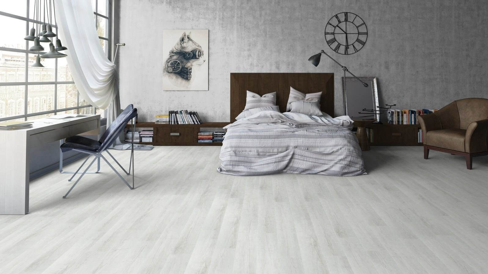 Для спальні, вітальні чи дитячої часто обирають ламінат у світлих або натуральних відтінках дерева: світлий дуб, натуральний дуб, скандинавський дуб, сіро-бежеві відтінки.