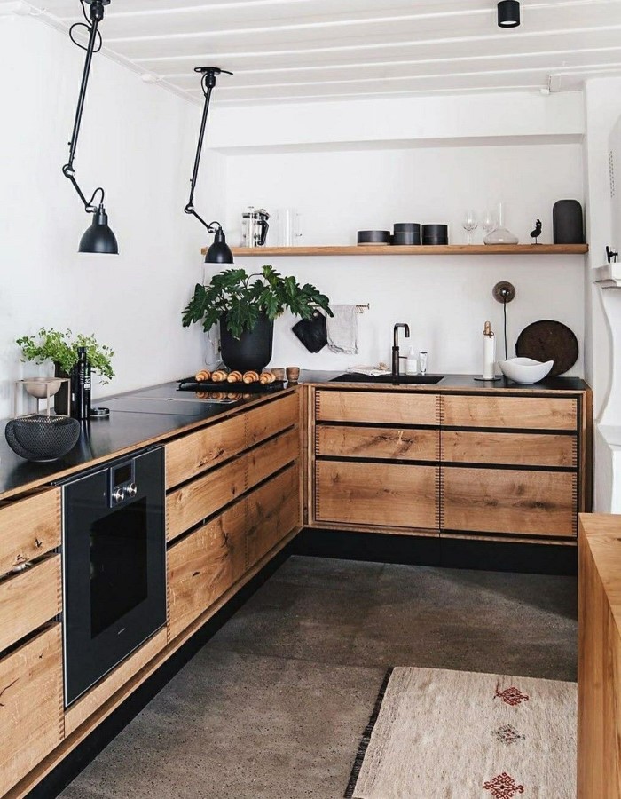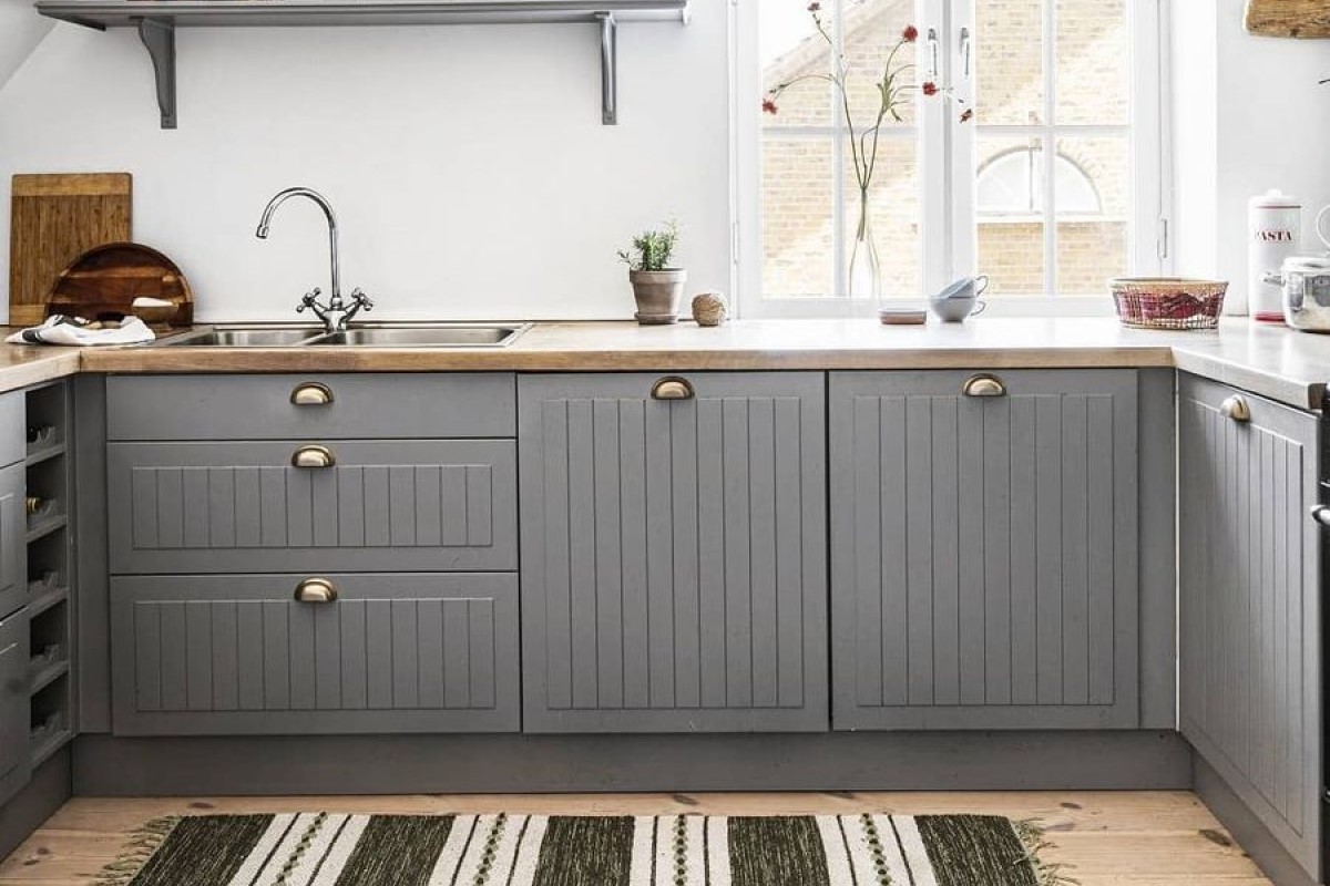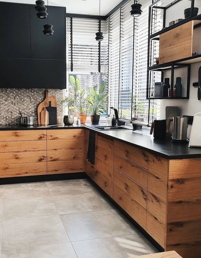 Контрастний чорний та нейтральний сірий Сіра кухня у скандинавському стилі – цілком допустимий варіант, для всіх хто боїться, що біла кухня загубиться на тлі таких ж білих стін. Сіра палітра нейтральна і не конфліктуватиме з акцентами та декором, але при цьому розбавить та оживить кімнату. Також сірий добре виглядатиме на стільниці і як обробка кухонного фартуха або підлоги. Чорний зараз на піку популярності, особливо якщо це стосується декору чи інших елементів. Для скандинавської кухні найоригінальнішим рішенням буде купити чорну кухонну мийку зі штучного каменю або стильний чорний змішувач.
