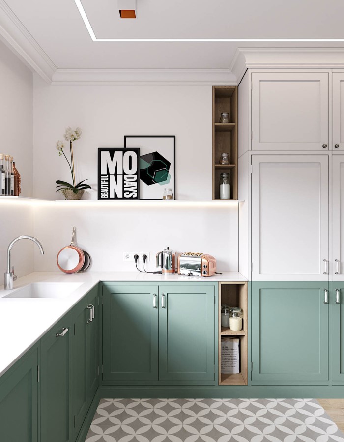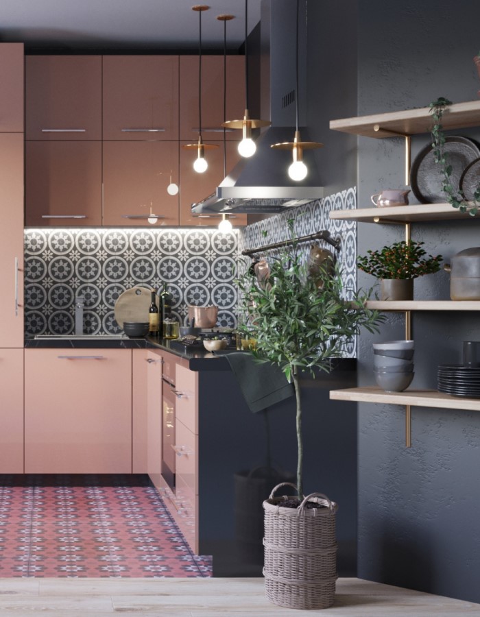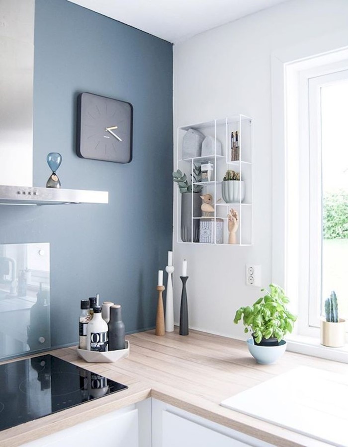 Яскраві та пастельні кольори Якщо є бажання хоч трохи урізноманітнити інтер'єр та додати на кухню кольори, використовуйте для фартуха чи кухонних фасадів ніжний пастельні кольори. Акценти теж краще розставляти за допомогою приглушених природних відтінків, які будуть доречно виглядати і не зіпсують загальний вигляд. Синій, блакитний та бірюза – найпопулярніші серед кольорів у сканді-дизайні. Небесна блакитна кухня у скандинавському стилі перегукується з білими стінами та підходить до відтінків білої деревини. А глибока синьова нагадує про заворожливі північні моря. Зелена палітра перегукується з лісовими відтінками вічнозеленої хвої та моху. Відтінки рожевої троянди - актуальний тренд, що проник у всі стилі, у тому числі і в скандинавський.