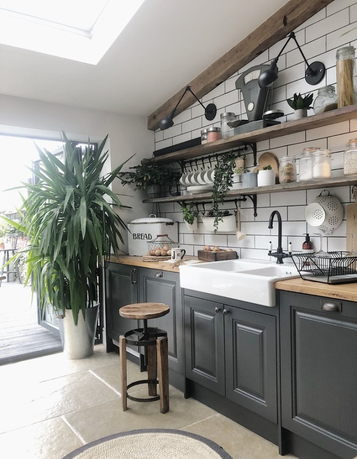 На відкритих полицях акуратно розставлений простий білий посуд, цікаві склянки з “битого” скла, раритетні вази, металеве кухонне начиння, книжка рецептів у пошарпаній палітурці. На стінах чорно-білі картини, постери чи фотографії у дерев'яних рамках із широким паспарту. На вікнах – легкі лляні фіранки. На підлозі – візерункова доріжка, плетена дбайливими бабусиними руками. Освіжити та оживити простір допоможуть кілька кімнатних рослин у керамічних горщиках.