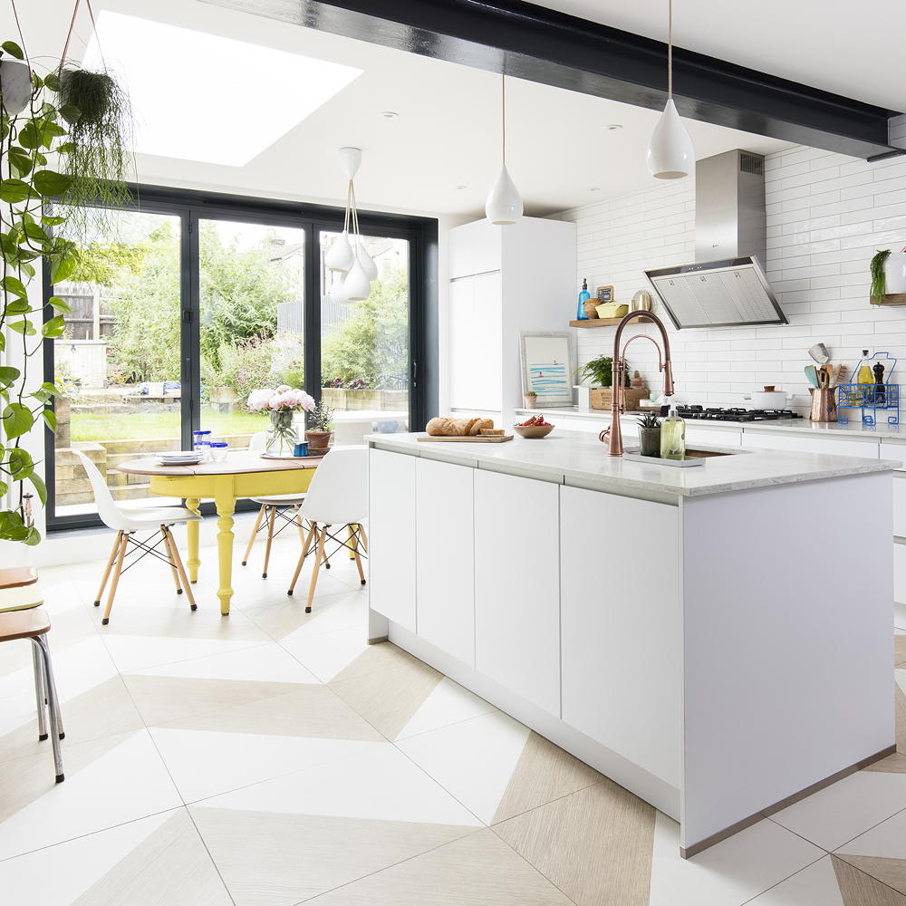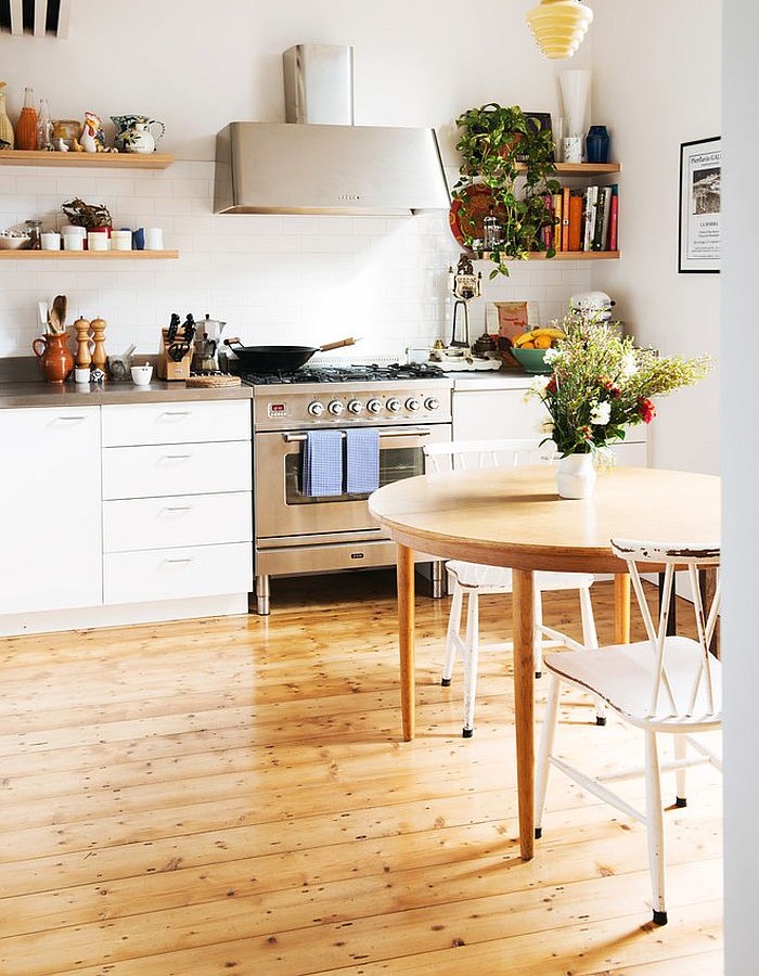 Підбираючи підлогове покриття для кухні не забувайте, що воно обов'язково має бути вологостійким та зносостійким. Дизайнери рекомендують для кухні в скандинавському стилі вибирати екологічні підлоги з дощок або вибіленого дерева. І хоча це вкрай непрактичний матеріал, серед асортименту сучасних покриттів для підлоги не складно підібрати вологостійкий ламінат, вінілову підлогу або керамограніт, які чудово імітують малюнок деревних порід, але при цьому підійдуть для експлуатації на кухні.