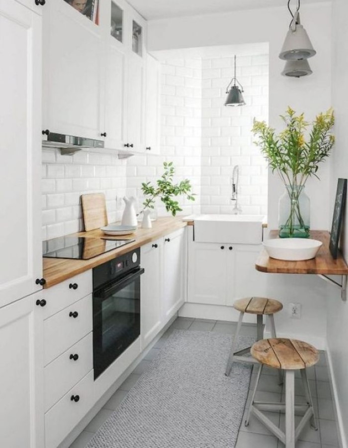 В умовах малогабаритної квартири-готельки основне завдання - поєднати на зовсім крихітному просторі робочу зону й їдальню, які б виглядали лаконічно та приємно у загальному житловому інтер'єрі. Маленька кухня в скандинавському стилі - слушний варіант. Тим більше в цьому демократичному дизайні цілком доречно виглядатимуть бюджетні матеріали та сантехніка. Хороша ідея - меблі-трансформери з розсувними або відкидними механізмами.