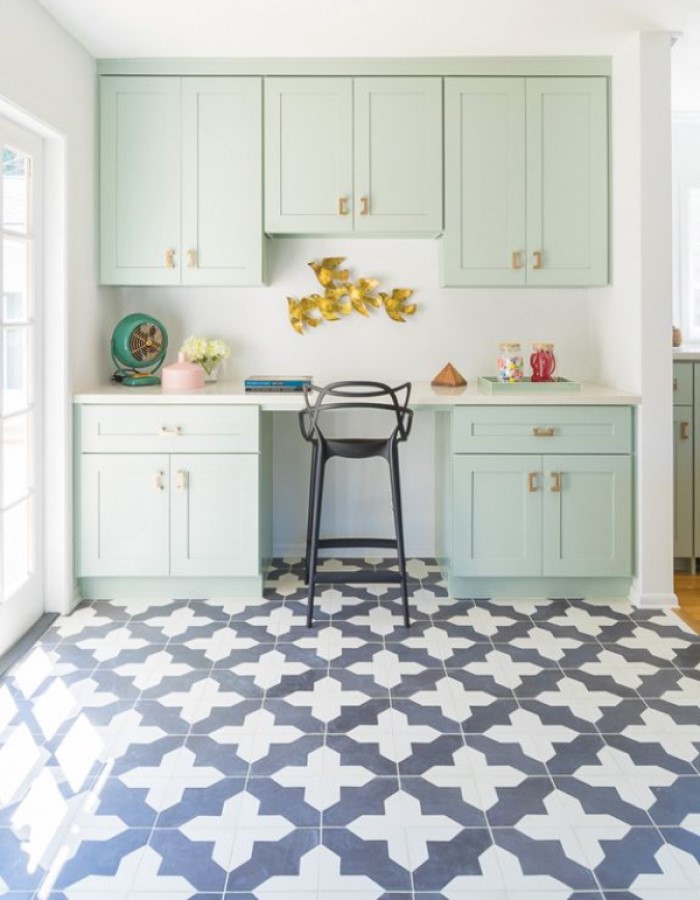 Інший варіант - підлогова керамічна плитка: популярний “пэчворк”, зі зістареними візерунками, шахова контрастна квадратна плитка, або кахель у формі гексагонів у різних відтінках сірого.