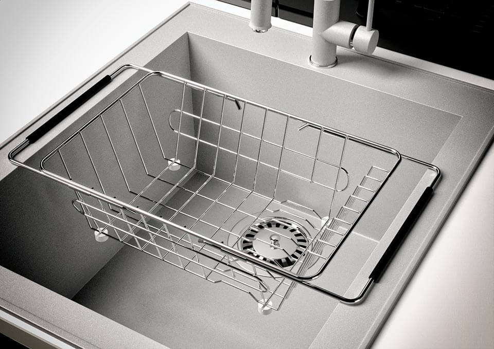 - Кошики: контейнери із прутів, що встановлюються поверх чаші, зроблять поділ брудного посуду, приладів або продуктів простіше та наочніше.