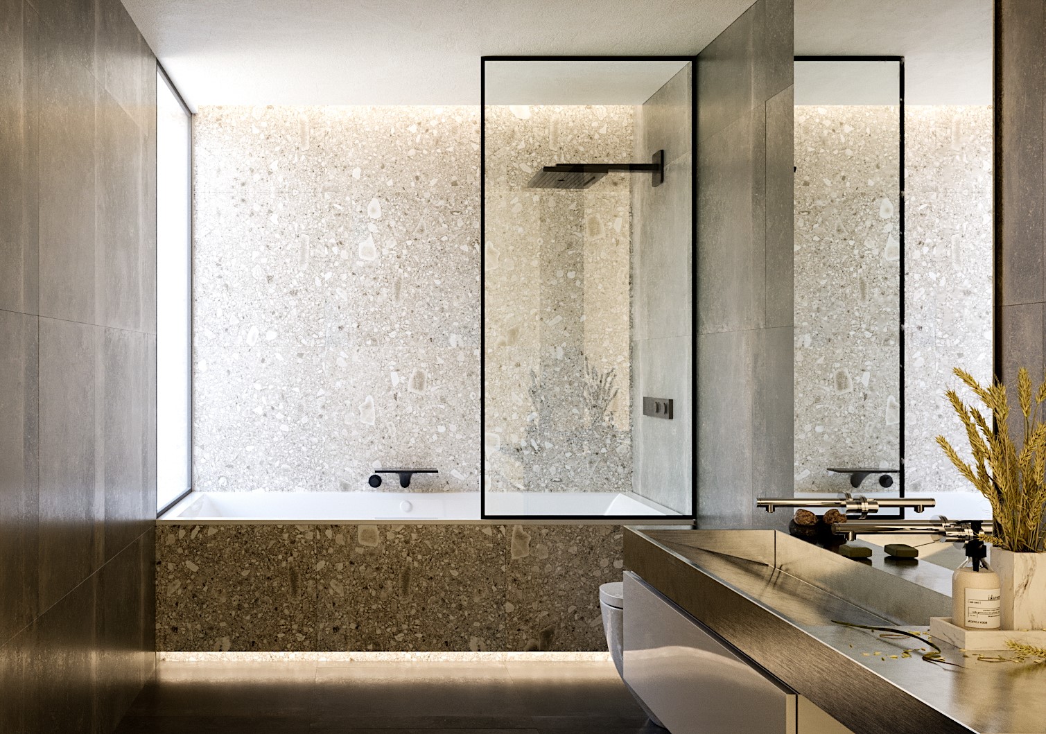 Штора Liberta у вузькому чорному матовому профілі – трендовий аксесуар сучасної ванної кімнати.