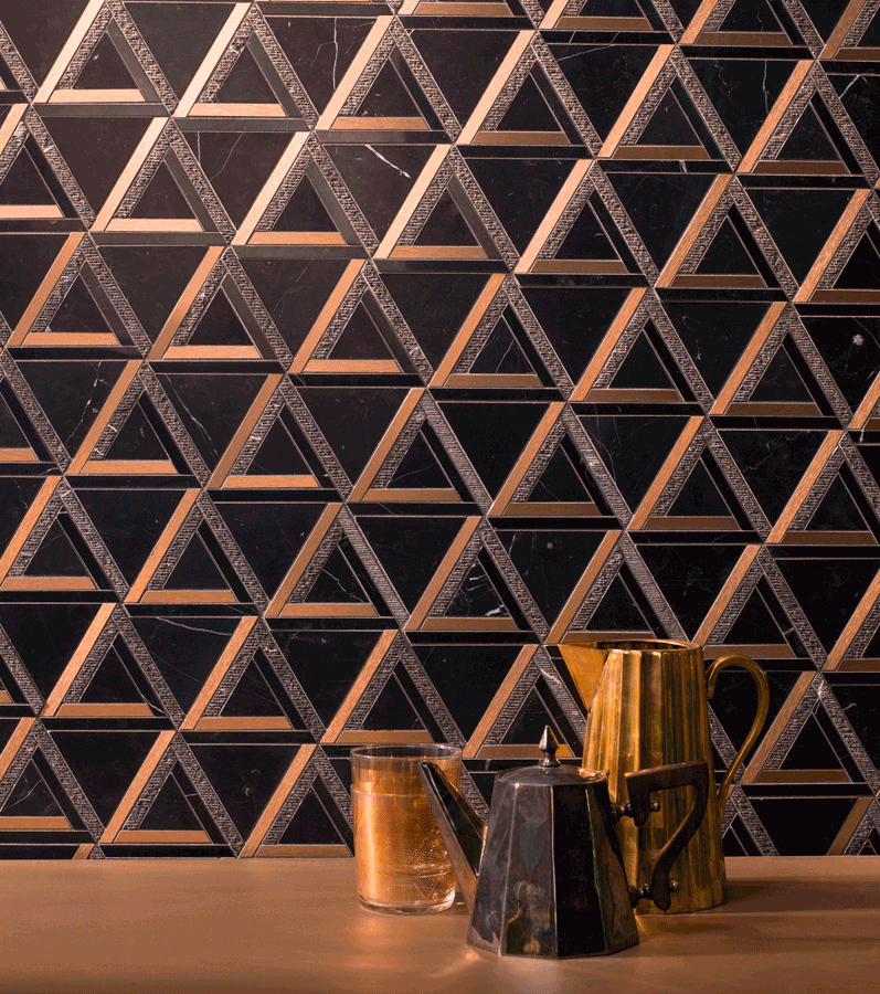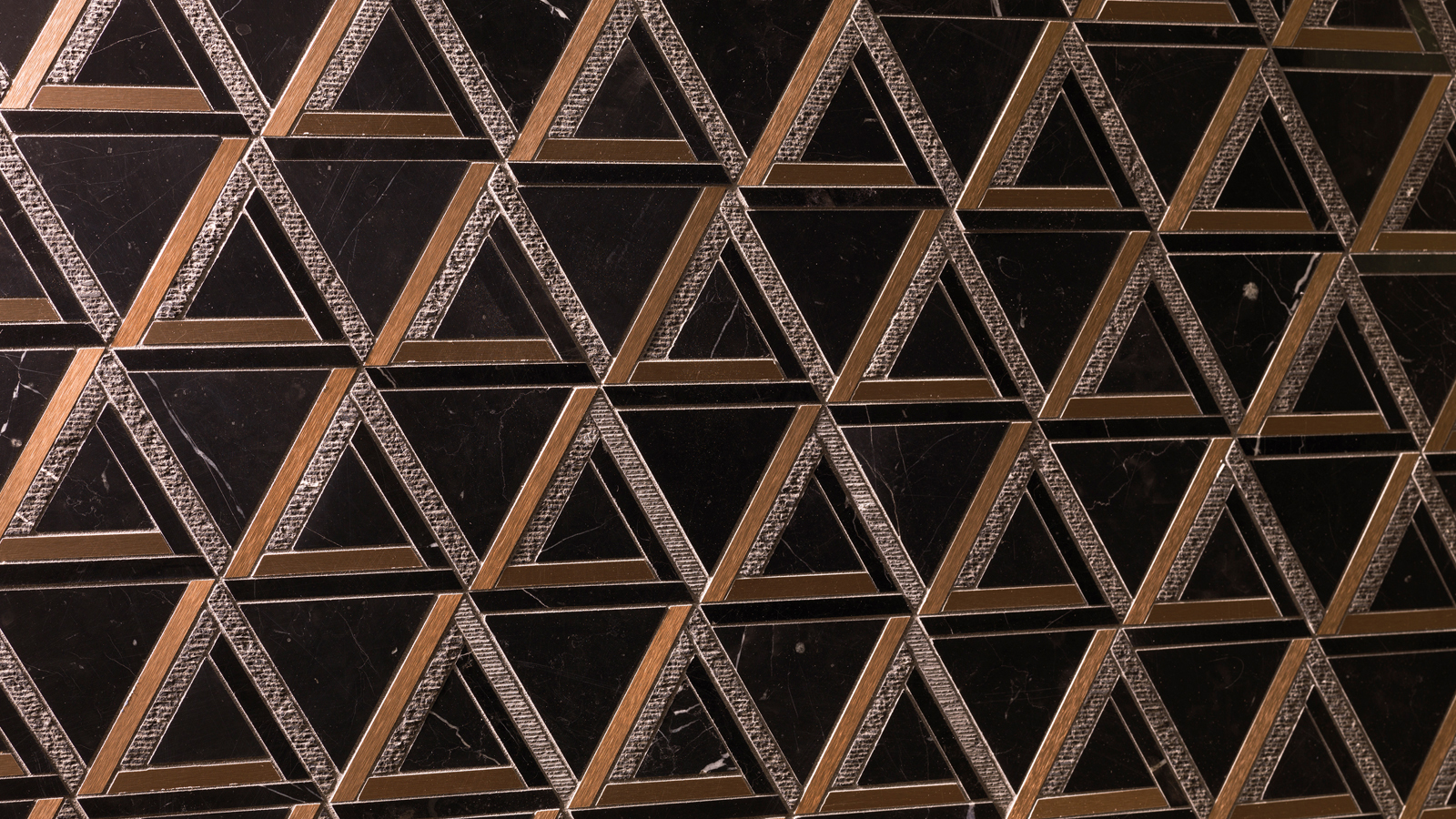 В коллекции Field треугольники из натурального камня дополняются металлическими кусочками, придавая помещениям блеск и изящество. Изделия многогранны и полны контрастов, а сочетание приятного на ощупь натурального камня с холодным металлом позволяет разбить структуру на разные зоны. Это возможно благодаря трем тонам мозаики: Black (черный цвет), Cooper (цвет «медь») и White (белый цвет). Оттенки камня наряду с отделкой в цвете меди и других металлов положены в основу элитных и уникальных интерьеров.