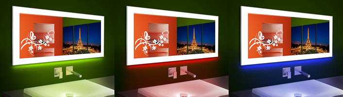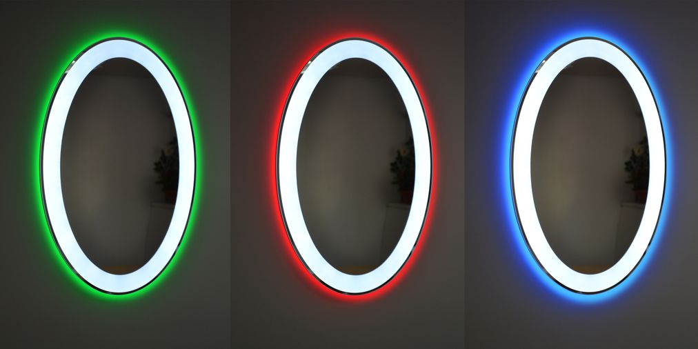 Цветное декоративное свечение по периметру зеркала (цветной ореол). Вы можете настроить любой цвет контурной подсветки при помощи пульта дистанционного управления. Кроме того, цвет может меняться по одной из нескольких программ. Использование динамически меняющейся подсветки очень украсит Ваше зеркало.