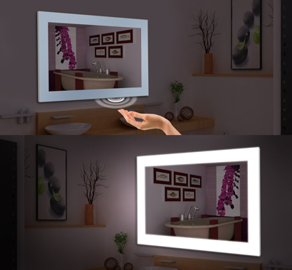 Подсветка включается и выключается при поднесении руки на расстояние около 5 см от сенсора, установленного на торце зеркала.