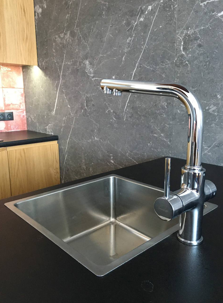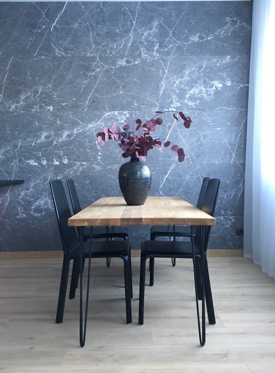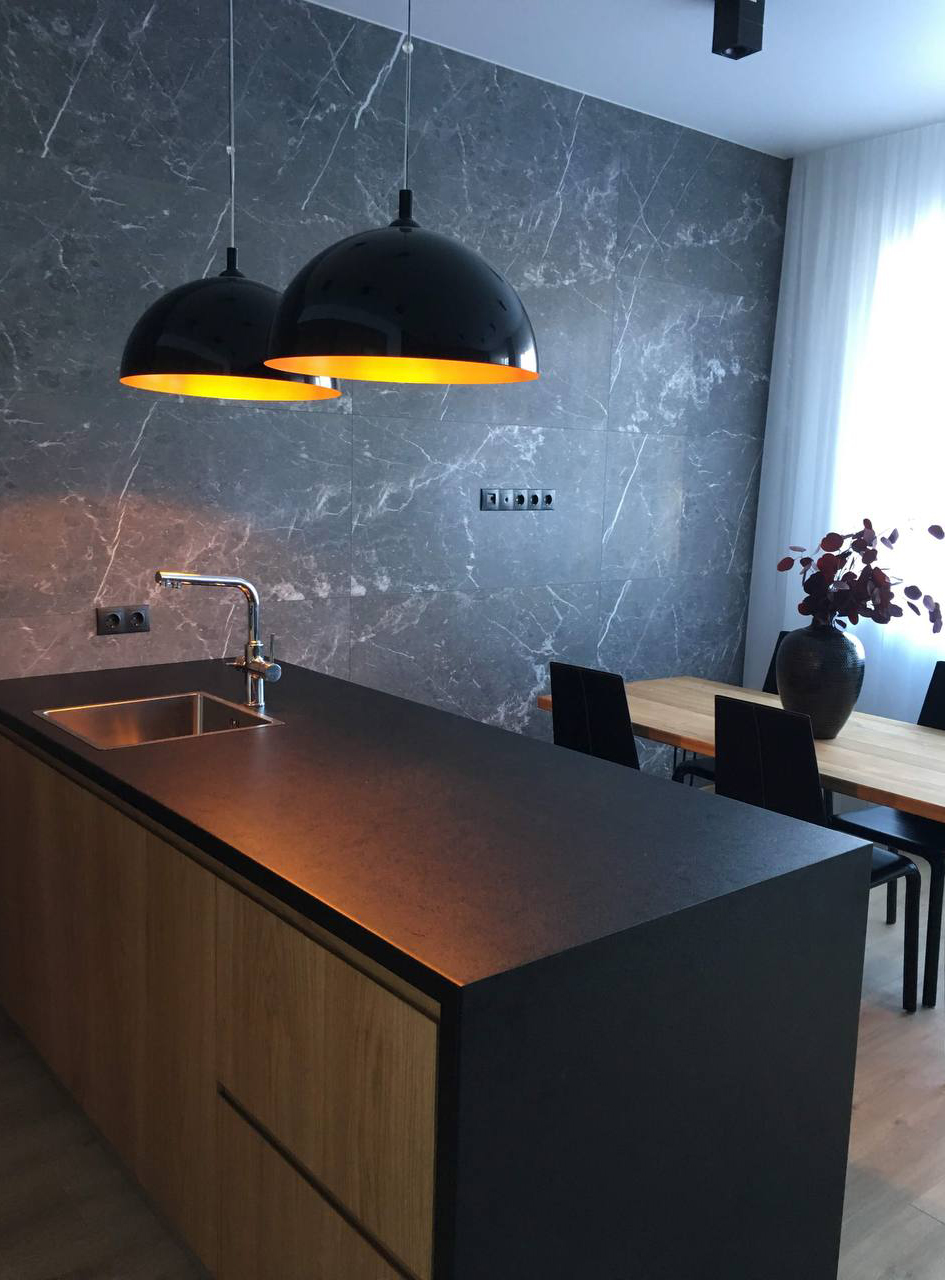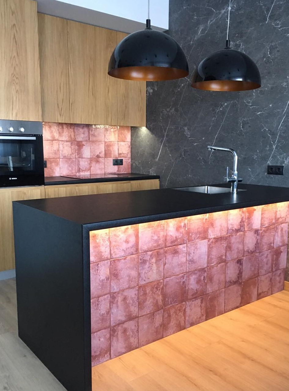 Реализованный проэкт 2019 года – 2-комнатная квартира в новострое в г. Харькове, выполненная в последних трендах дизайна. Ефектная кухня-студия приковывает взгляды благодаря интересному сочетанию черного мрамора, дерева и акцентной колоритной розовой плитке маленького формата. Керамогранит с имитацией мрамора и дерева – отличное функциональное решение для кухни.