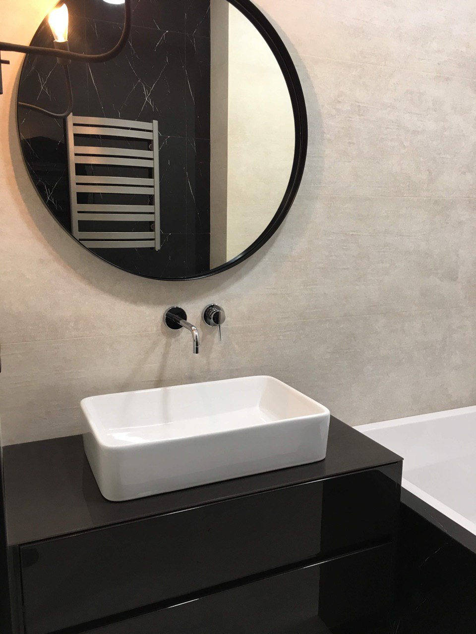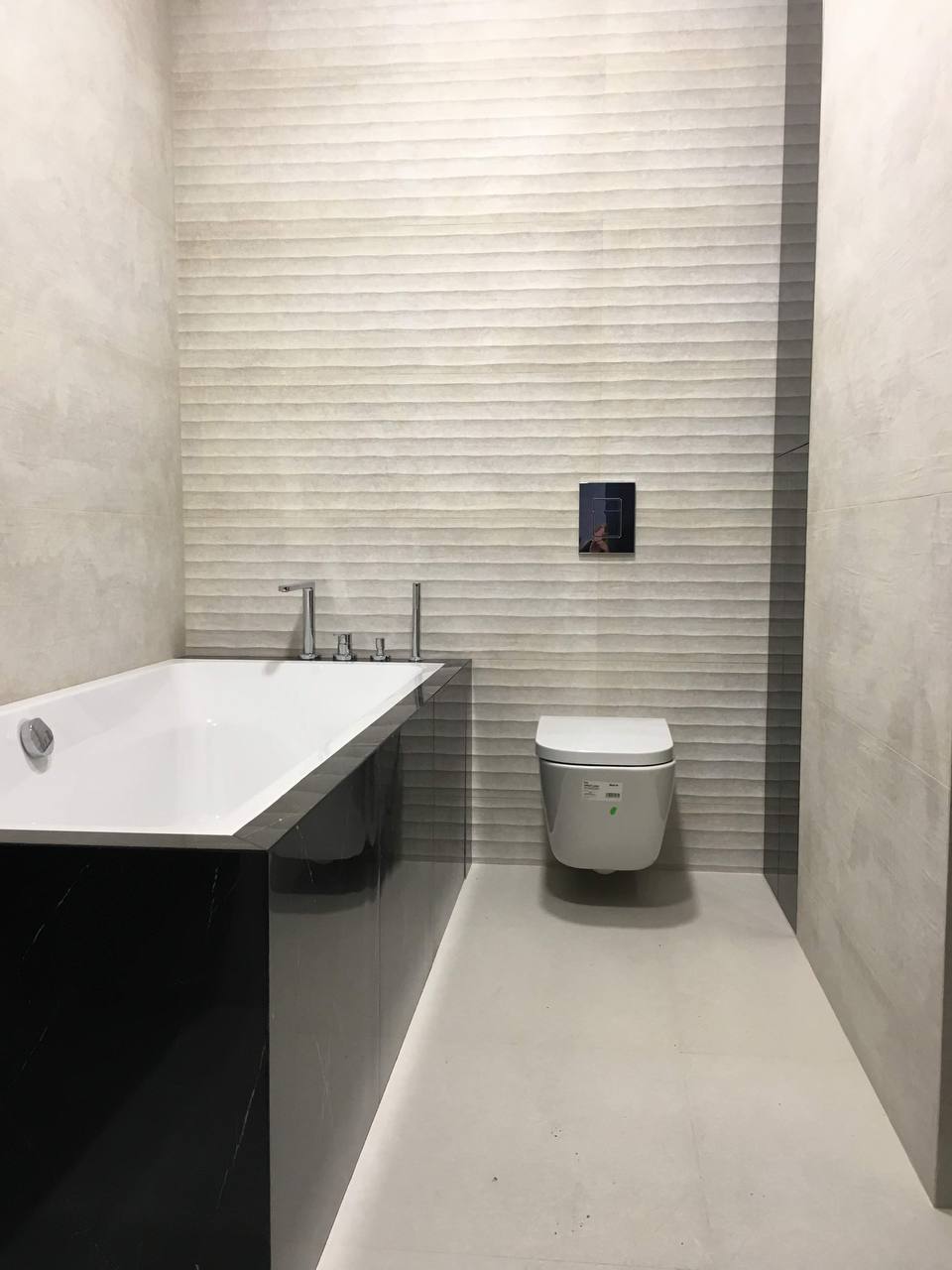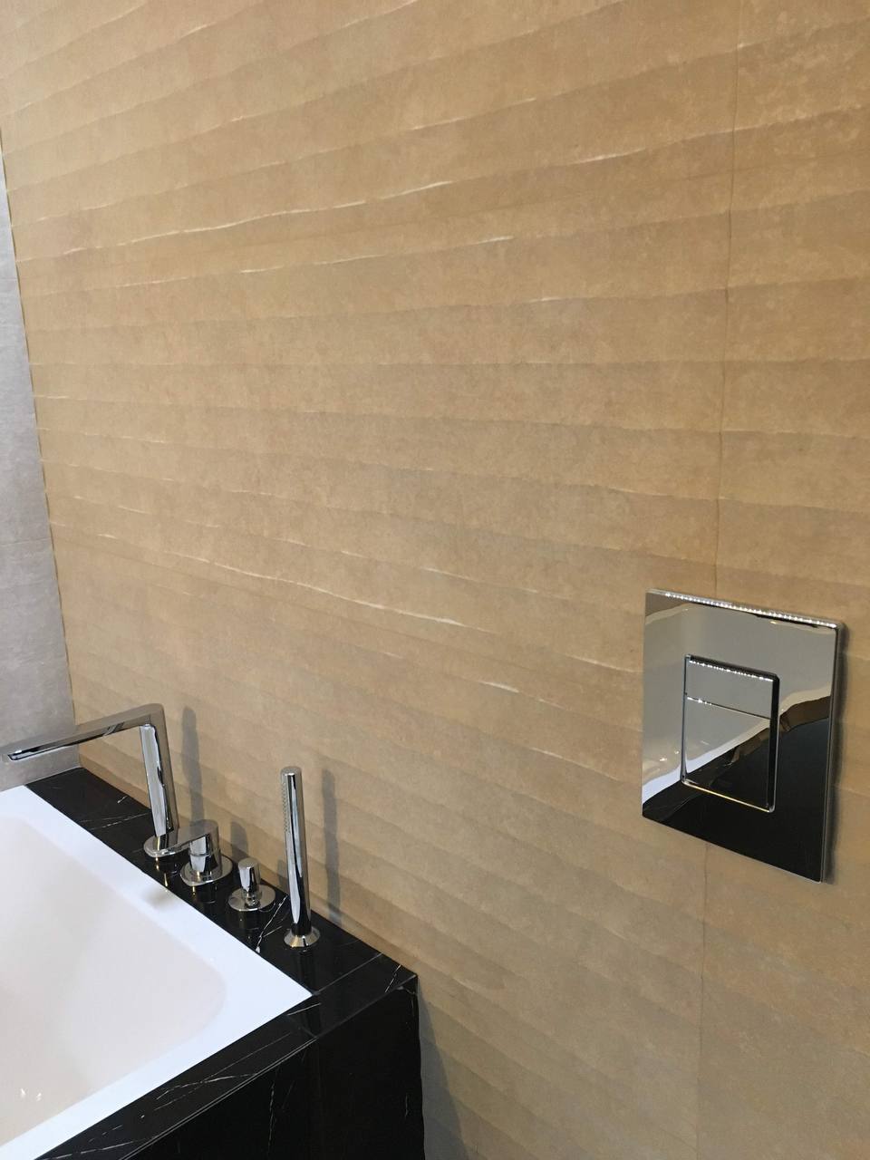 Ванная комната выполнена в светлых натуральных тонах с акцентом на рельефную волнообразную плитку и темный мрамор.