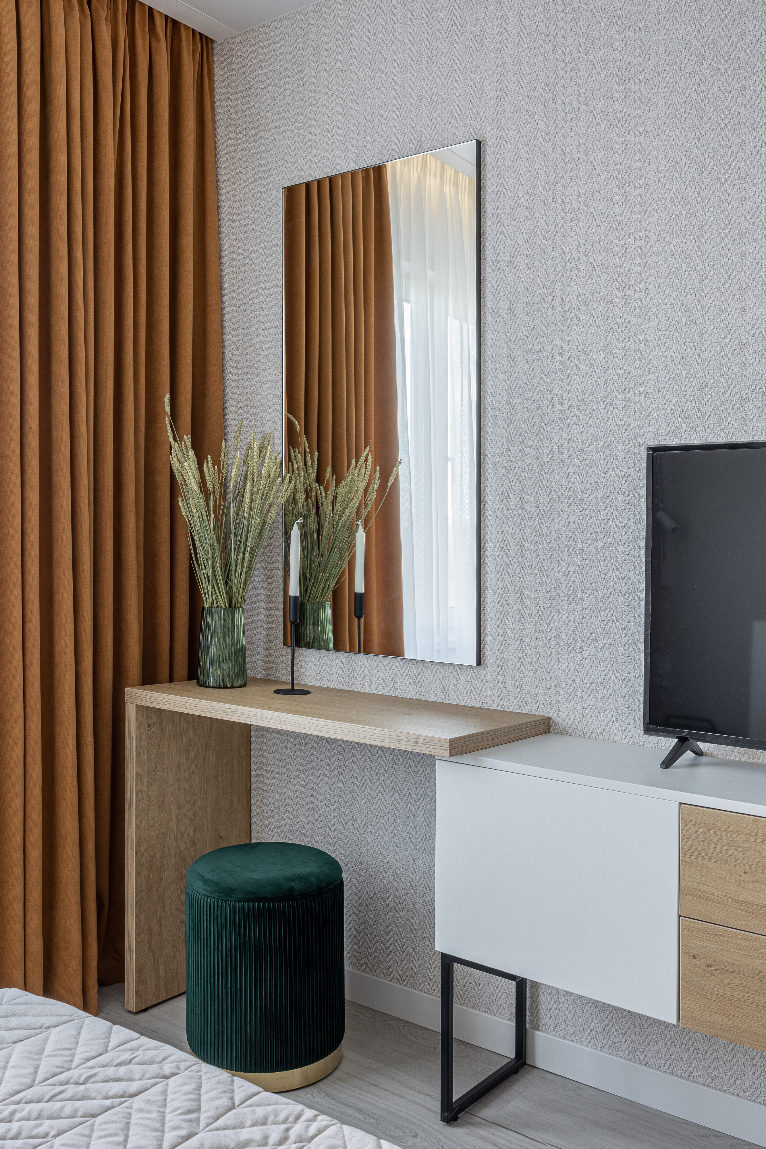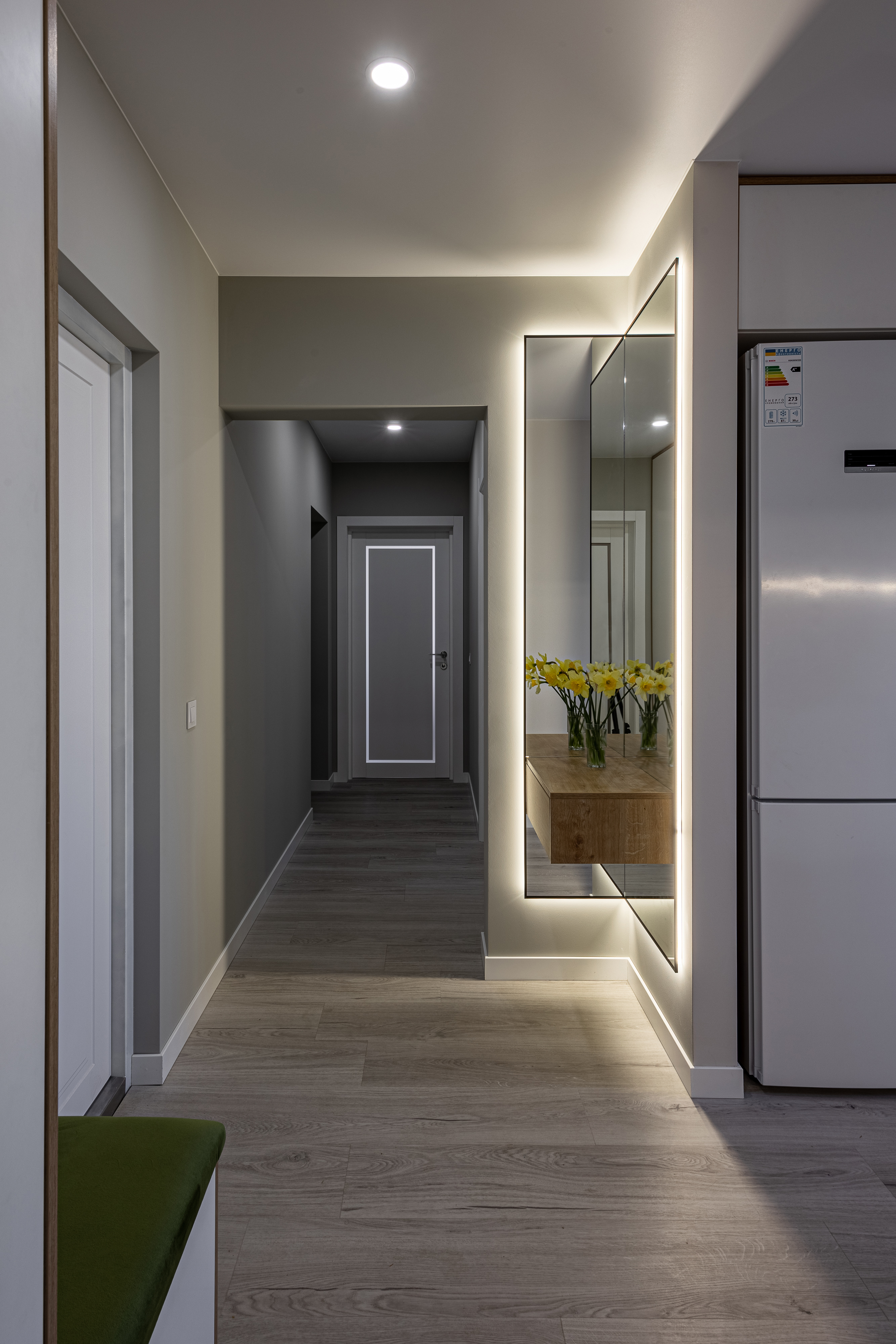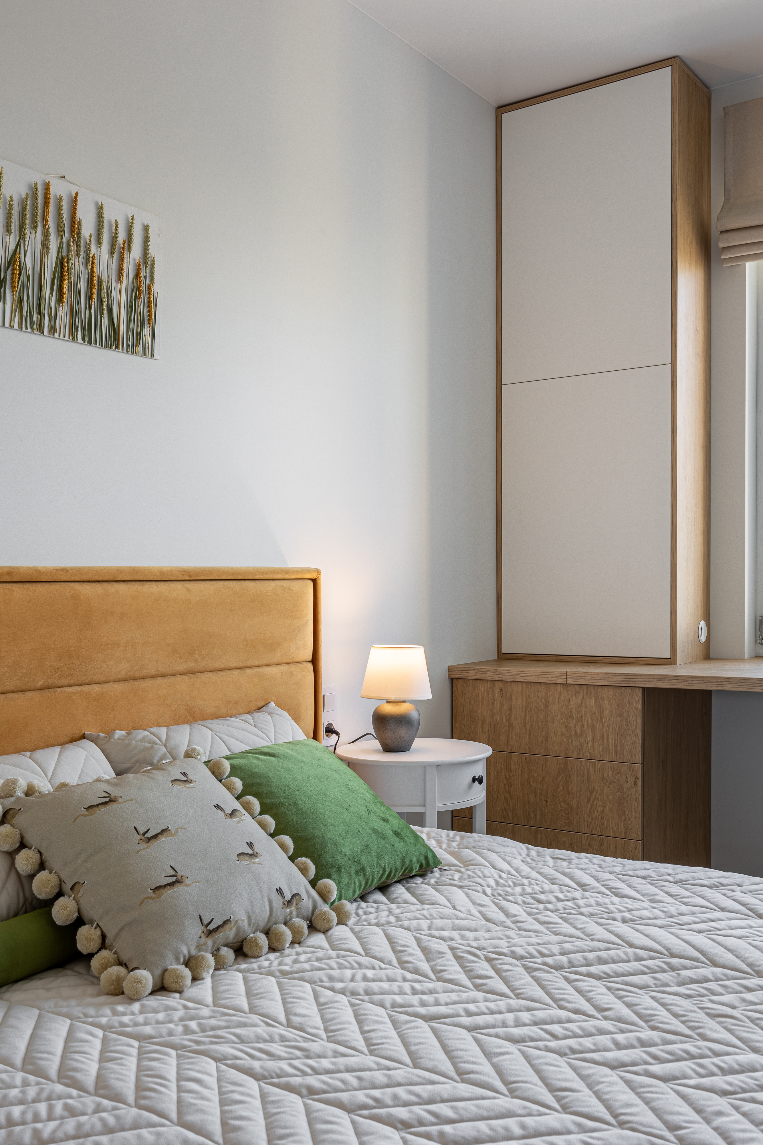 Интерьер квартиры наполнен светом, с атмосферой уюта, покоя и безмятежности. Спокойная природная цветовая гамма, трендовые акценты в фактурах и материалах. В результате получили цельный, стильный интерьер и счастливого заказчика.