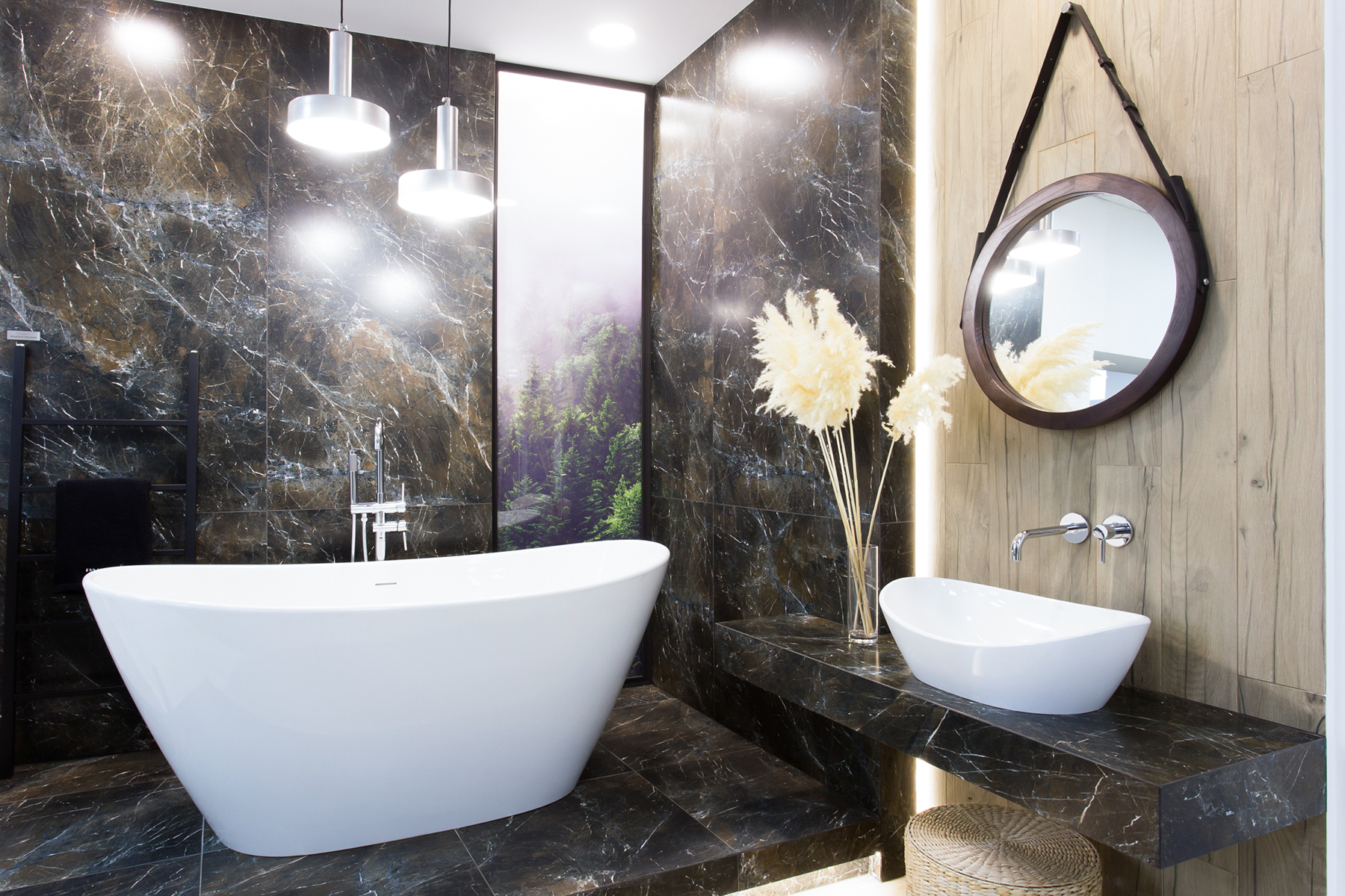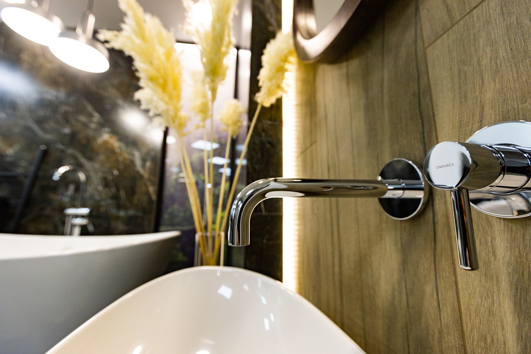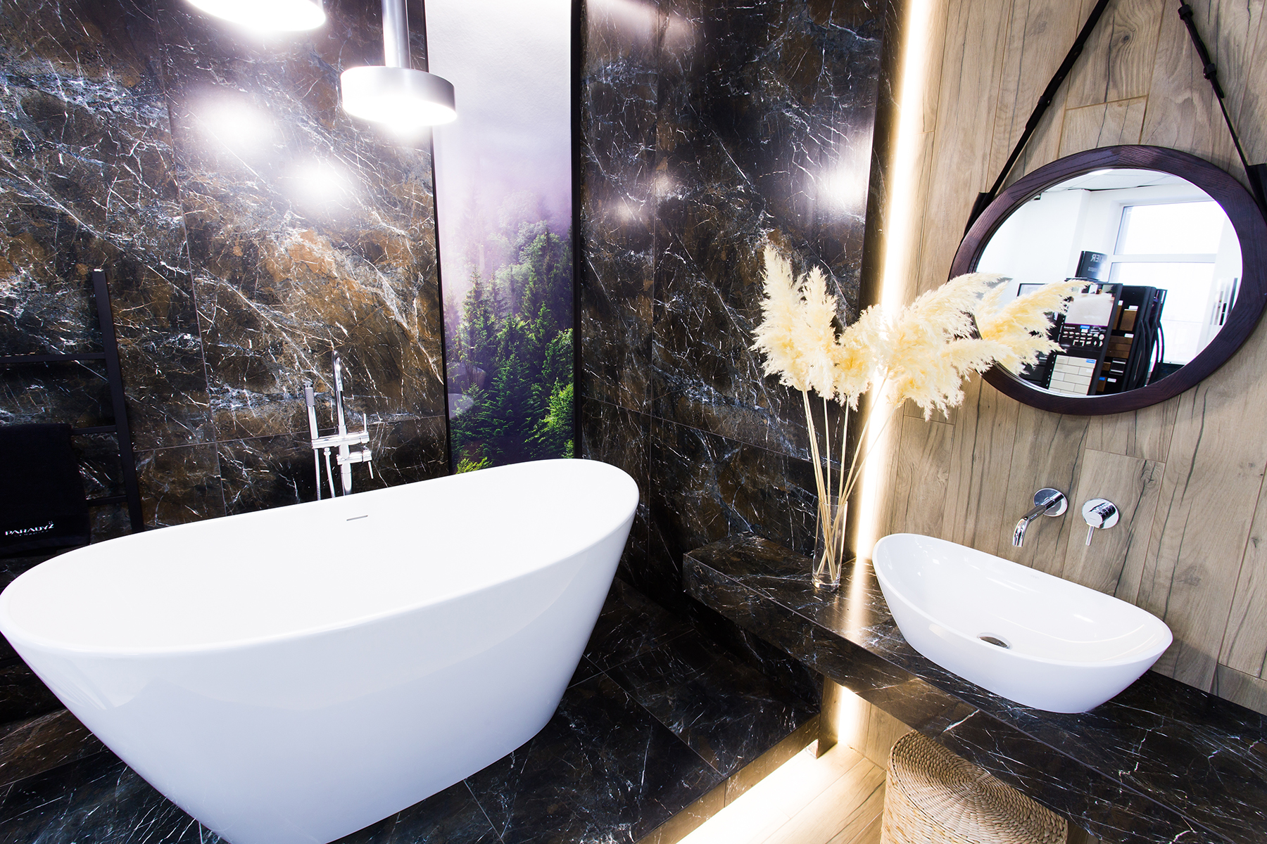 Дизайн интерьера импровизированной ванной комнаты, расположенной в шоуруме плитки Paradyz в салоне Keramis (г. Харьков, ул. Клочковская 159), восхищает с первого взгляда. Керамогранит с имитацией природного камня в темном цвете придает глубины, а керамогранит, имитирующий натуральную древесину – особого уюта. Главным акцентом интерьера становится роскошная каменная отдельностоящая ванна, к которой подобрана идентичная раковина. Столешница, выполнена из керамогранита, придает интерьеру целостности, а интересная подсветка бокса – раскрывает красоту текстур и деталей.