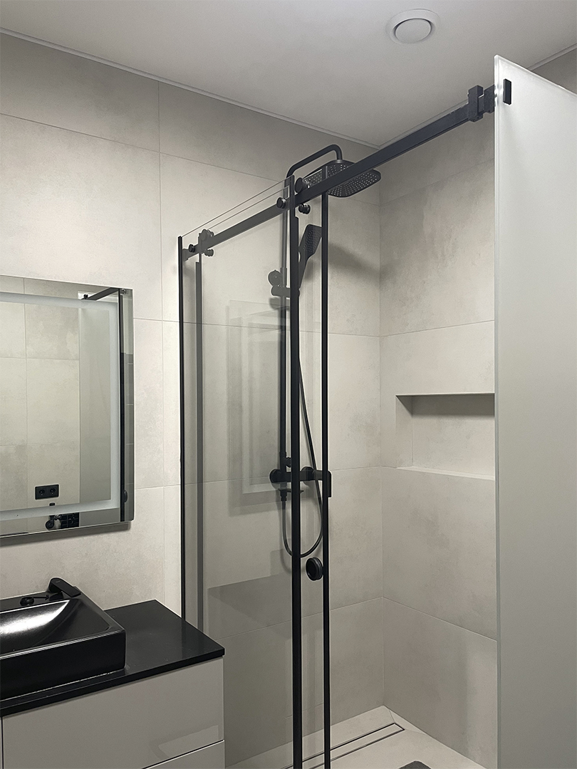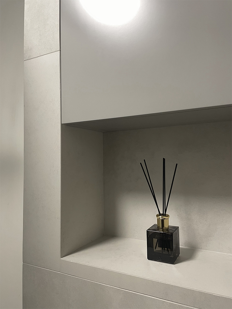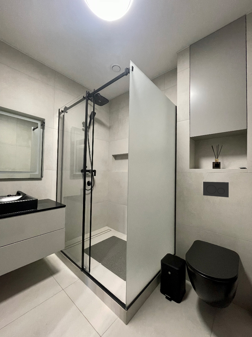 Санвузол 6 кв.м в стилі мінімалізм, продуманий до дрібниць, головною задачею якого стала зручніть та функціональніть. Керамограніт під бетон створює монолітний простір в трендовому сірому кольорі та акцентується чорною сантехнікою, керамікою та аксесуарами.