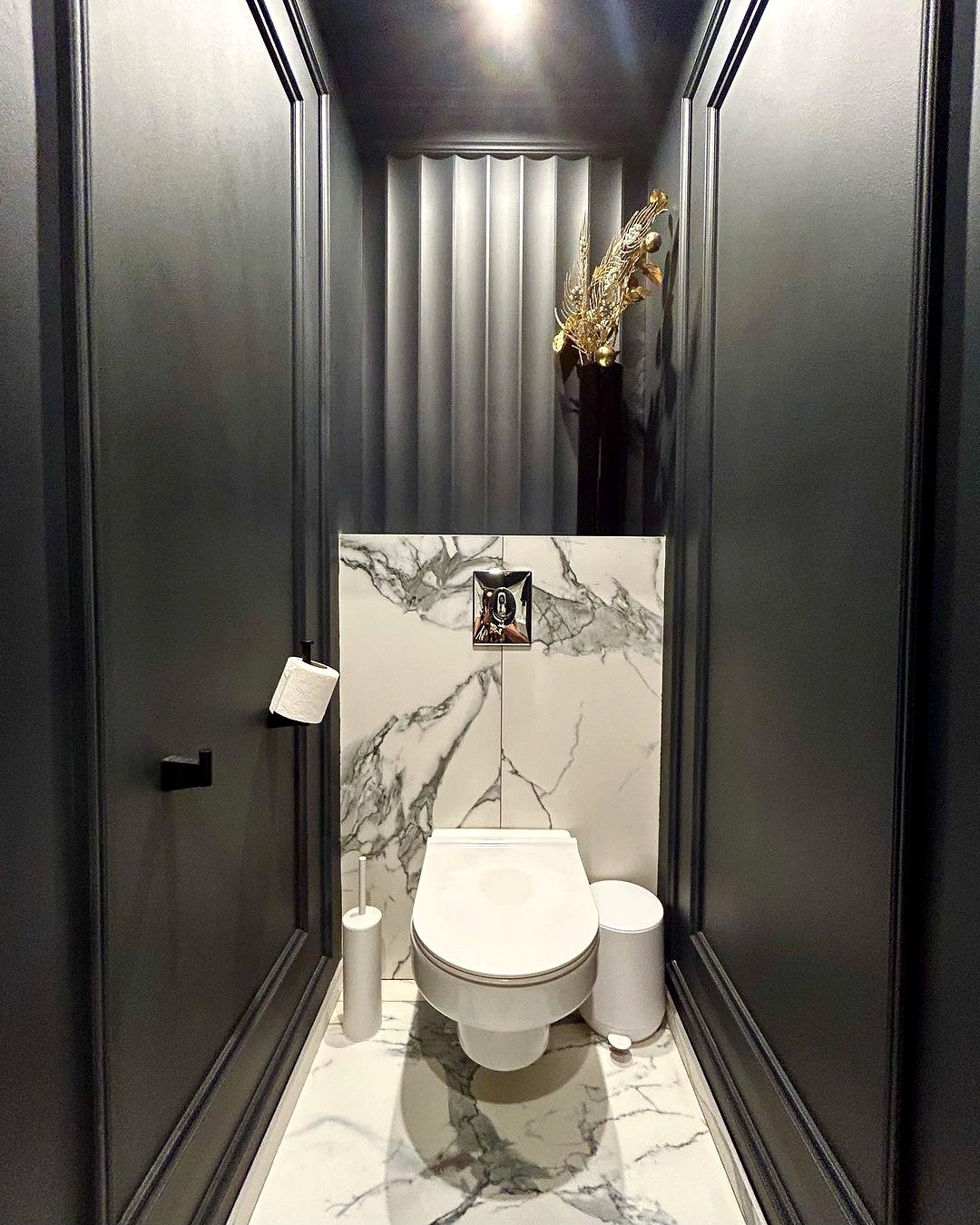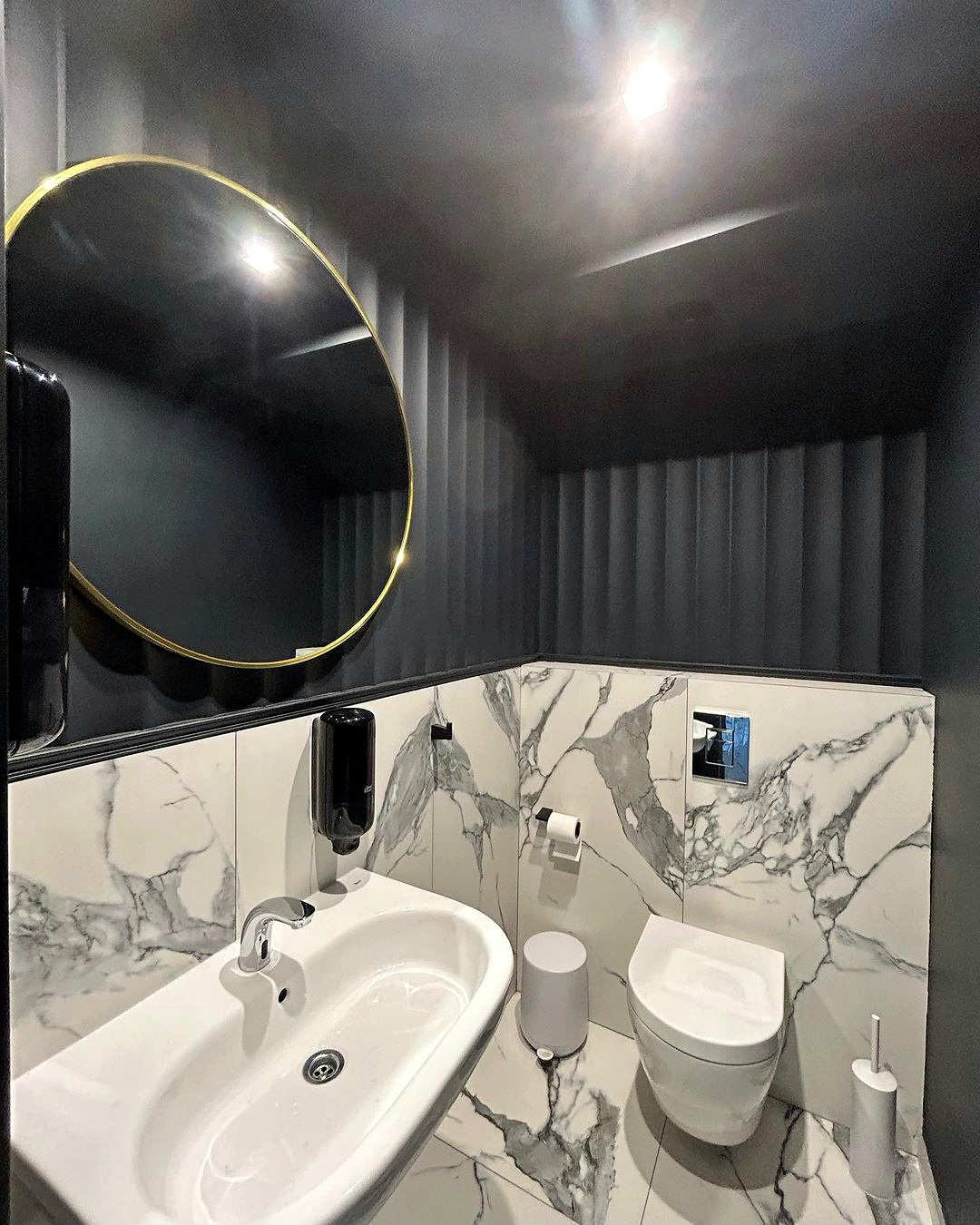 Цікаве поєднання неокласичного стилю із брутальним лофтом в серії санвузлів ресторанного комплексу "Tradicia Resto" стає продовженням головної стилістики банкетної зали. Керамограміт, що імітує природній мармур Calacatta вдало поєднується із білосніжкою керамікою та аксесуарами для ванної кімнати.