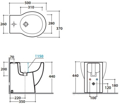 Напольное биде, с отверстием под смеситель, с переливом, размер 50х37х44 см, вес 20 кг, цвет белый