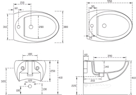 Биде подвесное, с одним отверстием под смеситель, белое, размер 55х38х41 см, вес 13 кг. Дополнительно комплектуется сифоном Р 91. Крепления для монтажа Р 55 входят в комплект поставки