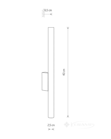 Высота составляет 400 мм, длина - 65 мм, ширина - 25 мм.