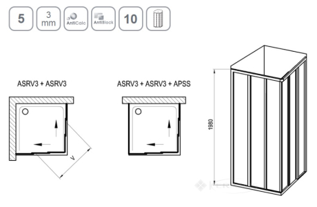 Для создания душевой кабины необходимо двое раздвижных дверей ASRV3, в комплектацию каждого из которых входит угловой соединитель. С помощью комбинации различных размеров двух частей получится квадратный или прямоугольный варианты душевой кабины (напр., 75 x 90 см, 80 x 90 см и так далее). Устанавливается в облицованный кафелем угол ванной комнаты на поддоны RAVAK Aneta, Angela, Perseus, Perseus Pro, Perseus Pro Flat, Perseus Pro Chrome, Perseus Pro 10° или непосредственно на пол со встроенным душевым каналом или трапом.