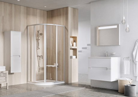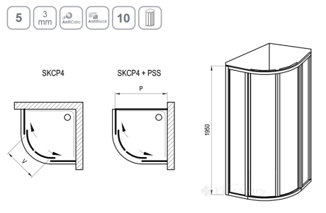 Изделие состоит из двух равных неподвижных частей и двух изогнутых частей, образующих раздвижные двери. Устанавливается в облицованный кафелем угол ванной комнаты на поддоны RAVAK Ronda, Elipso, Elipso Pro, Elipso Pro Flat, Elipso Pro Chrome или непосредственно на пол со встроенным душевым каналом или трапом.