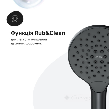 Ручной душ с 3 режимами подачи воды (Spray, EnerJet и Spray+Massage) изготовлен из высококачественного и экологически безопасного ABS-пластика, устойчивого к царапинам. Благодаря функции Rub&Clean его легко очищать от известкового налета.