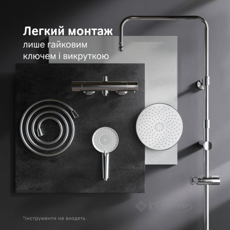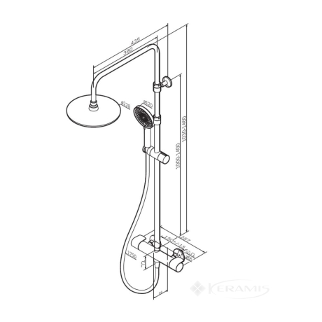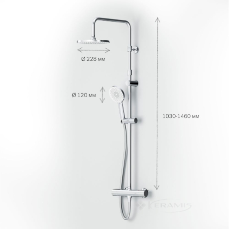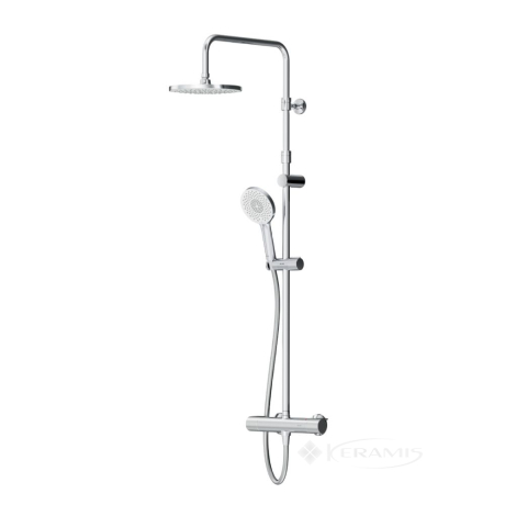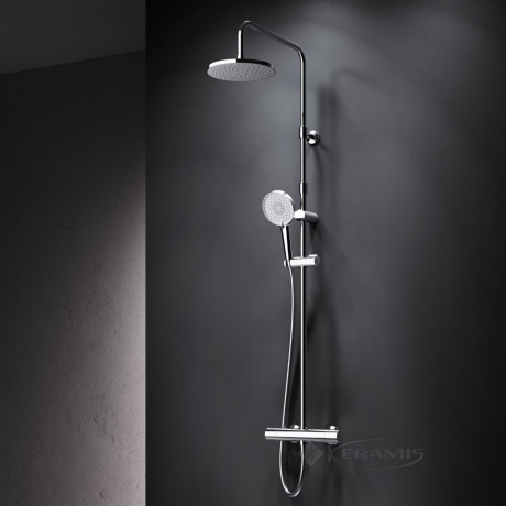 В состав душевой системы входят термостатический смеситель для душа, верхний тропический душ диаметром 22 см, ручной душ, душевая штанга высотой 1460 мм и душевой шланг длиной 1750 мм.