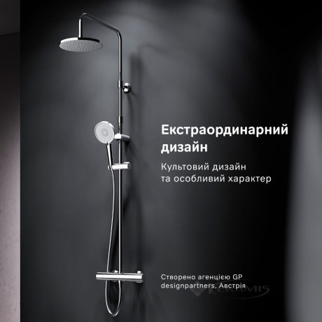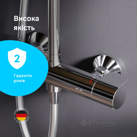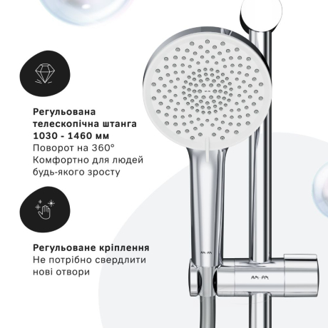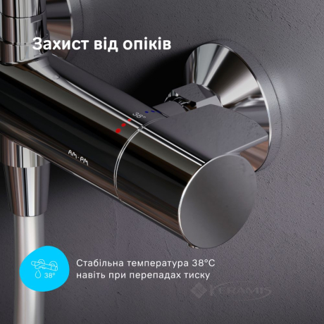 Душевой термостат с системой защиты от накипи надежно предохраняет от ожогов, поддерживая комфортную температуру воды даже при перепадах давления.