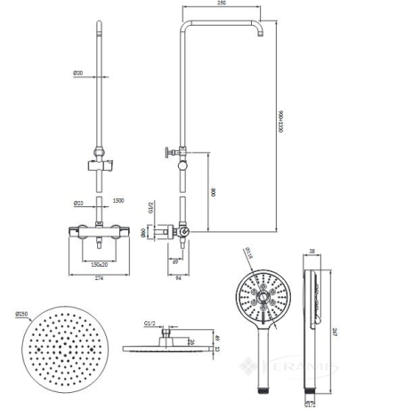- Состав комплектадушевая система с термостатом, верхним и ручным душем