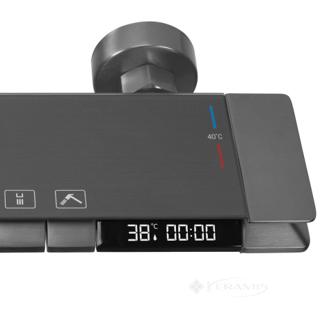 Душевая стойка, разработанная с учетом комфорта и функциональности. Благодаря особому этапу производства, гарантирует максимальную безопасность и комфорт при повседневном использовании. Произведена из латуни – прочного и устойчивого к коррозии материала. Уникальный дизайн и высокое качество используемых материалов гарантируют долговечность и надежность на долгие годы. Стойка включает в себя верхний душ и ручную лейку. Выполнена в трендовом графитовом цвете. Термостат позволяет выбрать и сохранить комфортную температру воды, которая будет показана на LCD дисплее. Уникальностью данной модели является верхний душ, а так же, дополнительные выходы воды из стойки.
