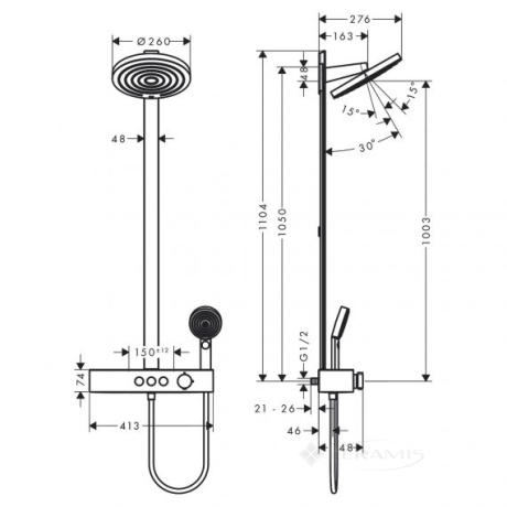 - Состоит из: верхний душ, ручной душ, термостат для душа, душевая штанга