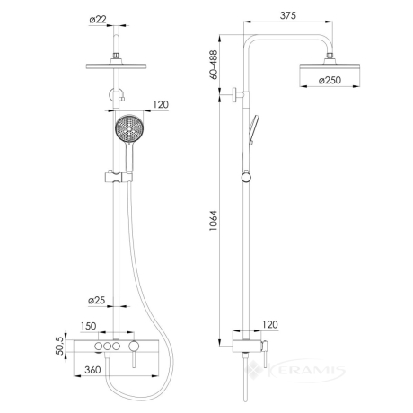 - Диаметр верхнего душа: 250 мм